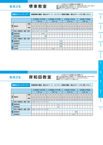 新高2生新高2生●同一名称の講座は設置校舎・設置期間(ターム)・授業時間(時限)が異なっても同一内容です。●担当講師は変更になる場合がありますので、あらかじめご了承ください。●講師のフルネームはWebサイトでご確認ください。この色のマスが授業のある時限です。●同一名称の講座は設置校舎・設置期間(ターム)・授業時間(時限)が異なっても同一内容です。●担当講師は変更になる場合がありますので、あらかじめご了承ください。●講師のフルネームはWebサイトでご確認ください。この色のマスが授業のある時限です。堺東教室講座名時限時間新高2準備英語-難関・標準-難関英語標準英語新高2準備数学-難関・標準-難関数学標準数学日本史世界史3/24(月)~3/27(木)3/28(金)~3/31(月)4/2(水)~4/5(土)4/6(日)~4/9(水)1ターム2ターム3ターム4ターム12345612345612345612345609:30〜11:0011:20〜12:5013:40〜15:1015:30〜17:0017:20〜18:5019:10〜20:4009:30〜11:0011:20〜12:5013:40〜15:1015:30〜17:0017:20〜18:5019:10〜20:4009:30〜11:0011:20〜12:5013:40〜15:1015:30〜17:0017:20〜18:5019:10〜20:4009:30〜11:0011:20〜12:5013:40〜15:1015:30〜17:0017:20〜18:5019:10〜20:404/2(水)〜4/3(木)17:20〜18:50金澤金澤金澤4/6(日)〜4/7(月)17:20〜18:50岸岸数野佐藤前田岸和田教室講座名時限時間新高2準備英語-難関・標準-難関英語標準英語新高2準備数学-難関・標準-難関数学標準数学3/24(月)~3/27(木)3/28(金)~3/31(月)4/2(水)~4/5(土)4/6(日)~4/9(水)1ターム2ターム3ターム4ターム12345612345612345612345609:30〜11:0011:20〜12:5013:40〜15:1015:30〜17:0017:20〜18:5019:10〜20:4009:30〜11:0011:20〜12:5013:40〜15:1015:30〜17:0017:20〜18:5019:10〜20:4009:30〜11:0011:20〜12:5013:40〜15:1015:30〜17:0017:20〜18:5019:10〜20:4009:30〜11:0011:20〜12:5013:40〜15:1015:30〜17:0017:20〜18:5019:10〜20:403/28(金)〜3/29(土)19:10〜20:40千代3/30(日)〜3/31(月)19:10〜20:40影平千代巽影平池田教科英語数学地歴教科英語数学●2025年度/春期講習/近畿/堺東/高2生/パターン14452025_58_5_533_32_20241107181019.csv/1ページ校了時削除