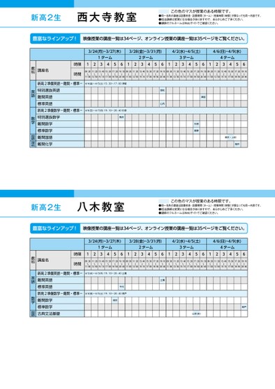 新高2生西大寺教室この色のマスが授業のある時限です。●同一名称の講座は設置校舎・設置期間(ターム)・授業時間(時限)が異なっても同一内容です。●担当講師は変更になる場合がありますので、あらかじめご了承ください。●講師のフルネームはWebサイトでご確認ください。3/24(月)~3/27(木)3/28(金)~3/31(月)4/2(水)~4/5(土)4/6(日)~4/9(水)1ターム2ターム3ターム4ターム12345612345612345612345609:30〜11:0011:20〜12:5013:40〜15:1015:30〜17:0017:20〜18:5019:10〜20:4009:30〜11:0011:20〜12:5013:40〜15:1015:30〜17:0017:20〜18:5019:10〜20:4009:30〜11:0011:20〜12:5013:40〜15:1015:30〜17:0017:20〜18:5019:10〜20:4009:30〜11:0011:20〜12:5013:40〜15:1015:30〜17:0017:20〜18:5019:10〜20:404/4(金)〜4/5(土)15:30〜17:00津留4/6(日)〜4/7(月)19:10〜20:40杉原駒井国松山内津留杉原数野青木・上田福井講座名時限時間新高2準備英語-難関・標準-特別選抜英語難関英語標準英語新高2準備数学-難関・標準-特別選抜数学難関数学標準数学難関国語難関化学教科英語数学国語理科新高2生八木教室この色のマスが授業のある時限です。●同一名称の講座は設置校舎・設置期間(ターム)・授業時間(時限)が異なっても同一内容です。●担当講師は変更になる場合がありますので、あらかじめご了承ください。●講師のフルネームはWebサイトでご確認ください。3/24(月)~3/27(木)3/28(金)~3/31(月)4/2(水)~4/5(土)4/6(日)~4/9(水)1ターム2ターム3ターム4ターム12345612345612345612345609:30〜11:0011:20〜12:5013:40〜15:1015:30〜17:0017:20〜18:5019:10〜20:4009:30〜11:0011:20〜12:5013:40〜15:1015:30〜17:0017:20〜18:5019:10〜20:4009:30〜11:0011:20〜12:5013:40〜15:1015:30〜17:0017:20〜18:5019:10〜20:4009:30〜11:0011:20〜12:5013:40〜15:1015:30〜17:0017:20〜18:5019:10〜20:404/2(水)〜4/3(木)19:10〜20:40土橋千代4/4(金)〜4/5(土)19:10〜20:40髙戸池田土橋山本(ま)髙戸講座名時限時間新高2準備英語-難関・標準-難関英語標準英語新高2準備数学-難関・標準-難関数学標準数学古典文法基礎教科英語数学国語●2025年度/春期講習/近畿/西大寺/高2生/パターン14452025_58_5_535_32_20241107181019.csv/1ページ校了時削除