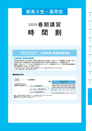 大阪校上本町校天王寺校京都校神戸三宮校豊中高槻堺東岸和田西大寺八木新高2生この色のマスが授業のある時限です。●同一名称の講座は設置校舎・設置期間(ターム)・授業時間(時限)が異なっても同一内容です。●担当講師は変更になる場合がありますので、あらかじめご了承ください。●講師のフルネームはWebサイトでご確認ください。新高3生・高卒生2025春期講習時間割授業を欠席しなければならないときも安心!対面授業振替受講制度対面授業振替受講制度学校行事や部活などやむを得ない理由で授業を欠席する場合、他のターム(設置期間)や時限、あるいは他校舎の同一名称講座の同一講に授業を振り替えて受講できる制度です(一部講座を除く)。詳細は、「申込マイページ」内の「各種ご案内ダウンロード」に掲載されている、「【2025年度春期講習】振替受講制度のご案内」をご確認ください。※別の講座や異なる講、授業形式の異なる映像授業やオンライン授業に振り替えることはできません。※一部、対象外の学年・校舎・教室があります。この色のマスが授業のある時限です。新高2生●同一名称の講座は設置校舎・設置期間(ターム)・授業時間(時限)が異なっても同一内容です。●担当講師は変更になる場合がありますので、あらかじめご了承ください。●講師のフルネームはWebサイトでご確認ください。●時間割の見方山田担当講師名上記の色のマスが授業のある時限です。3ターム6限の授業です。2タームの1・2限が授業です。2タームの3限が授業です。(例)109:3011:00211:2012:50池田4/2(水)〜4/5(土)3ターム3413:4015:1015:3017:00517:2018:50619:1020:40松原畑中・阪上・杉井●同一名称の講座は設置校舎・設置期間(ターム)・授業時間(時限)が異なっても同一内容です。●担当講師は変更になる場合がありますので、あらかじめご了承ください。●講師のフルネームはWebサイトでご確認ください。