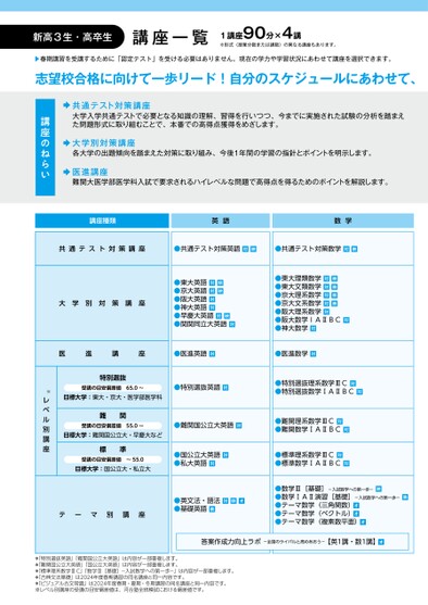 新高3生・高卒生講座一覧1講座90分×4講※形式(授業分数または講数)の異なる講座もあります。▶春期講習を受講するために「認定テスト」を受ける必要はありません。現在の学力や学習状況にあわせて講座を選択できます。志望校合格に向けて一歩リード!自分のスケジュールにあわせて、共通テスト対策講座大学入学共通テストで必要となる知識の理解、習得を行いつつ、今までに実施された試験の分析を踏まえた問題形式に取り組むことで、本番での高得点獲得をめざします。大学別対策講座各大学の出題傾向を踏まえた対策に取り組み、今後1年間の学習の指針とポイントを明示します。医進講座難関大医学部医学科入試で要求されるハイレベルな問題で高得点を得るためのポイントを解説します。講座のねらい講座種類英語数学共通テスト対策講座●共通テスト対策英語対映●共通テスト対策数学対映大学別対策講座●東大英語対映●京大英語対映●阪大英語対●神大英語対●早慶大英語対映●関関同立大英語対●東大理類数学対映●東大文類数学対映●京大理系数学対映●京大文系数学対映●阪大理系数学対●阪大数学IAⅡBC対●神大数学対●特別選抜英語対●特別選抜理系数学ⅢC対●特別選抜数学ⅠAⅡBC対●難関国公立大英語対●難関理系数学ⅢC対●難関数学ⅠAⅡBC対●国公立大英語対●私大英語対●標準理系数学ⅢC対●標準数学ⅠAⅡBC対特別選抜受講の目安偏差値65.0~目標大学:東大・京大・医学部医学科難関受講の目安偏差値55.0~目標大学:難関国公立大・早慶大など標準受講の目安偏差値~55.0目標大学:国公立大・私立大※レベル別講座医進講座●医進英語対●医進数学対テーマ別講座●英文法・語法対映オ●基礎英語映●数学Ⅲ[基礎]-入試数学への第一歩-映●数学ⅠAⅡ演習[基礎]-入試数学への第一歩-映●テーマ数学(三角関数)オ●テーマ数学(ベクトル)オ●テーマ数学(複素数平面)オ答案作成力向上ラボ-全国のライバルと高めあおう-【英1講・数1講】オ*「特別選抜英語」「難関国公立大英語」は内容が一部重複します。*「難関国公立大英語」「国公立大英語」は内容が一部重複します。*「標準理系数学ⅢC」「数学Ⅲ[基礎]-入試数学への第一歩-」は内容が一部重複します。*「古典文法基礎」は2024年度春期講習の同名講座と同一内容です。*「ビジュアル古文常識」は2024年度春期・夏期・冬期講習の同名講座と同一内容です。※レベル別講座の受講の目安偏差値は、河合塾全統模試における偏差値です。