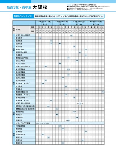 新高3生・高卒生大阪校この色のマスが授業のある時限です。●同一名称の講座は設置校舎・設置期間(ターム)・授業時間(時限)が異なっても同一内容です。●担当講師は変更になる場合がありますので、あらかじめご了承ください。●講師のフルネームはWebサイトでご確認ください。3/24(月)~3/27(木)3/28(金)~3/31(月)4/2(水)~4/5(土)4/6(日)~4/9(水)1ターム2ターム3ターム4ターム12345612345612345612345609:30〜11:0011:20〜12:5013:40〜15:1015:30〜17:0017:20〜18:5019:10〜20:4009:30〜11:0011:20〜12:5013:40〜15:1015:30〜17:0017:20〜18:5019:10〜20:4009:30〜11:0011:20〜12:5013:40〜15:1015:30〜17:0017:20〜18:5019:10〜20:4009:30〜11:0011:20〜12:5013:40〜15:1015:30〜17:0017:20〜18:5019:10〜20:40時限時間講座名教科川口刀木下香川西岡久末木下西浦池谷西浦香川瀬戸山西浦寺尾西浦寺尾佐野江本久末島田藤野藤野上高原奥村・上田・畑河村西浦佐佐木阪上菅井一番合戦一番戦北野山本(ま)4/6(日)17:20〜20:40阪上瀧澤吉田古川古川影山宮本西尾小倉上住山本(和)大學西高木共通テスト対策英語東大英語京大英語阪大英語神大英語早慶大英語関関同立大英語医進英語難関国公立大英語国公立大英語英文法・語法共通テスト対策数学東大理類数学東大文類数学京大理系数学京大文系数学阪大理系数学阪大数学ⅠAⅡBC神大数学医進数学難関理系数学ⅢC難関数学ⅠAⅡBC標準理系数学ⅢC標準数学ⅠAⅡBC共通テスト対策国語難関国公立大現代文(論述対策)難関国公立大古文(論述対策)難関現代文難関古文標準現代文標準古文ビジュアル古文常識特別選抜物理難関物理標準物理特別選抜化学難関化学標準化学難関生物早慶大日本史日本史論述世界史論述日本史世界史小論文英語数学国語理科地歴小論文●2025年度/春期講習/近畿/大阪/高3・卒生/パターン14452025_58_5_511_11_20241107181019.csv/1ページ校了時削除