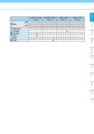 4/6(日)17:20〜20:40阪上一番合戦北野山本(ま)菅井瀧澤吉田3/24(月)~3/27(木)3/28(金)~3/31(月)4/2(水)~4/5(土)大學4/6(日)~4/9(水)古川1ターム2ターム3ターム4ターム1234古川5612345612345612345609:30〜11:0011:20〜12:5013:40〜15:1015:30〜17:0017:20〜18:5019:10〜20:4009:30〜11:0011:20〜12:5013:40〜15:1015:30〜17:00西17:20〜18:5019:10〜20:4009:30〜11:0011:20〜12:5013:40〜15:1015:30〜17:00西岡西17:20〜18:5019:10〜20:4009:30〜11:0011:20〜12:5013:40〜15:1015:30〜17:0017:20〜18:5019:10〜20:40川口影山宮本小倉刀木下香川上住山本(和)久末高木佐野島田時間時限難関現代文難関古文標準現代文標準古文ビジュアル古文常識特別選抜物理難関物理標準物理特別選抜化学難関化学標準化学難関生物共通テスト対策英語東大英語述京大英語述阪大英語神大英語早慶大英語関関同立大英語医進英語難関国公立大英語国公立大英語英文法・語法共通テスト対策数学東大理類数学東大文類数学京大理系数学京大文系数学阪大理系数学阪大数学ⅠAⅡBC神大数学医進数学難関理系数学ⅢC難関数学ⅠAⅡBC標準理系数学ⅢC標準数学ⅠAⅡBC共通テスト対策国語難関国公立大現代文(論述対策)難関国公立大古文(論述対策)難関現代文難関古文標準現代文標準古文ビジュアル古文常識特別選抜物理難関物理標準物理特別選抜化学難関化学標準化学難関生物早慶大日本史日本史論述世界史論述日本史世界史小論文国語理科教科地歴英語小論文数学国語理科地歴小論文●2025年度/春期講習/近畿/大阪/高3・卒生/パターン14452025_58_5_511_11_20241107181019.csv/1ページ江本校了時削除河村木下西浦池谷西浦香川瀬戸山西浦寺尾西浦寺尾藤野久末藤野西浦佐佐木阪上菅井奥村・上田・畑上高原一番合戦北野山本(ま)4/6(日)17:20〜20:40阪上瀧澤吉田古川古川影山宮本西尾小倉上住山本(和)大學西高木●2025年度/春期講習/近畿/大阪/高3・卒生/パターン14452025_58_5_511_11_20241107181019.csv/1ページ校了時削除