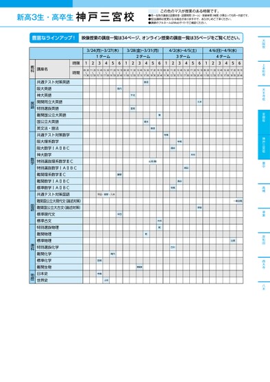●同一名称の講座は設置校舎・設置期間(ターム)・授業時間(時限)が異なっても同一内容です。●担当講師は変更になる場合がありますので、あらかじめご了承ください。●講師のフルネームはWebサイトでご確認ください。この色のマスが授業のある時限です。新高3生・高卒生大阪校上本町校天王寺校京都校神戸三宮校豊中高槻堺東岸和田西大寺八木3/24(月)~3/27(木)3/28(金)~3/31(月)4/2(水)~4/5(土)4/6(日)~4/9(水)1ターム2ターム3ターム4ターム12345612345612345612345609:30〜11:0011:20〜12:5013:40〜15:1015:30〜17:0017:20〜18:5019:10〜20:4009:30〜11:0011:20〜12:5013:40〜15:1015:30〜17:0017:20〜18:5019:10〜20:4009:30〜11:0011:20〜12:5013:40〜15:1015:30〜17:0017:20〜18:5019:10〜20:4009:30〜11:0011:20〜12:5013:40〜15:1015:30〜17:0017:20〜18:5019:10〜20:40島田西内千代堂前久末慎清水島田山本(敏)寺尾寺尾涌谷涌谷寺尾木村湘田一番合戦伊賀辻居大村乾乾古川平田・青野・八木藤野中田岡内宮路寺島上住野黒美時限時間講座名教科共通テスト対策英語阪大英語神大英語関関同立大英語特別選抜英語難関国公立大英語国公立大英語英文法・語法共通テスト対策数学阪大理系数学阪大数学ⅠAⅡBC神大数学特別選抜理系数学ⅢC特別選抜数学ⅠAⅡBC難関理系数学ⅢC難関数学ⅠAⅡBC標準数学ⅠAⅡBC共通テスト対策国語難関国公立大現代文(論述対策)難関国公立大古文(論述対策)標準現代文標準古文特別選抜物理難関物理標準物理特別選抜化学難関化学標準化学難関生物日本史世界史英語数学国語理科地歴神戸三宮校●2025年度/春期講習/近畿/神戸三宮/高3・卒生/パターン14452025_58_5_514_11_20241107181019.csv/1ページ校了時削除