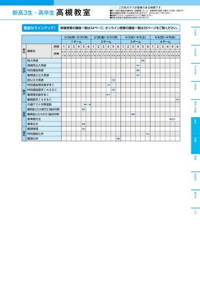 ●同一名称の講座は設置校舎・設置期間(ターム)・授業時間(時限)が異なっても同一内容です。●担当講師は変更になる場合がありますので、あらかじめご了承ください。●講師のフルネームはWebサイトでご確認ください。●現役生教室の受講対象は新高3生のみです。この色のマスが授業のある時限です。新高3生・高卒生大阪校上本町校天王寺校京都校神戸三宮校豊中高槻堺東岸和田西大寺八木3/24(月)~3/27(木)3/28(金)~3/31(月)4/2(水)~4/5(土)4/6(日)~4/9(水)1ターム2ターム3ターム4ターム12345612345612345612345609:30〜11:0011:20〜12:5013:40〜15:1015:30〜17:0017:20〜18:5019:10〜20:4009:30〜11:0011:20〜12:5013:40〜15:1015:30〜17:0017:20〜18:5019:10〜20:4009:30〜11:0011:20〜12:5013:40〜15:1015:30〜17:0017:20〜18:5019:10〜20:4009:30〜11:0011:20〜12:5013:40〜15:1015:30〜17:0017:20〜18:5019:10〜20:40三枝中田上村影平堂前松本堂前松井瀬島宮路北山奥村・堀奥村島田中出中川野口(た)講座名時限時間阪大英語関関同立大英語特別選抜英語難関国公立大英語国公立大英語特別選抜理系数学ⅢC特別選抜数学ⅠAⅡBC難関理系数学ⅢC難関数学ⅠAⅡBC共通テスト対策国語難関国公立大現代文(論述対策)難関国公立大古文(論述対策)標準現代文標準古文難関物理特別選抜化学難関化学教科英語数学国語理科高槻教室●2025年度/春期講習/近畿/高槻教室/高3・卒生/パターン14452025_58_5_540_11_20241107181019.csv/1ページ校了時削除