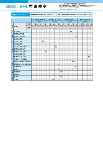 ●同一名称の講座は設置校舎・設置期間(ターム)・授業時間(時限)が異なっても同一内容です。●担当講師は変更になる場合がありますので、あらかじめご了承ください。●講師のフルネームはWebサイトでご確認ください。●現役生教室の受講対象は新高3生のみです。この色のマスが授業のある時限です。新高3生・高卒生3/24(月)~3/27(木)3/28(金)~3/31(月)4/2(水)~4/5(土)4/6(日)~4/9(水)1ターム2ターム3ターム4ターム12345612345612345612345609:30〜11:0011:20〜12:5013:40〜15:1015:30〜17:0017:20〜18:5019:10〜20:4009:30〜11:0011:20〜12:5013:40〜15:1015:30〜17:0017:20〜18:5019:10〜20:4009:30〜11:0011:20〜12:5013:40〜15:1015:30〜17:0017:20〜18:5019:10〜20:4009:30〜11:0011:20〜12:5013:40〜15:1015:30〜17:0017:20〜18:5019:10〜20:40金澤西田西田中田信岡青木山内杉原岸杉原阪上堀辻居佐藤前田野口(た)・阪上池田野口(た)野口)野口(た)野口(た本瀬講座名時限時間阪大英語関関同立大英語難関国公立大英語国公立大英語英文法・語法阪大理系数学阪大数学ⅠAⅡBC難関理系数学ⅢC難関数学ⅠAⅡBC標準理系数学ⅢC標準数学ⅠAⅡBC共通テスト対策国語難関国公立大現代文(論述対策)難関国公立大古文(論述対策)標準現代文標準古文難関物理難関化学日本史世界史教科英語数学国語理科地歴堺東教室●2025年度/春期講習/近畿/堺東/高3・卒生/パターン14452025_58_5_533_11_20241107181019.csv/1ページ校了時削除