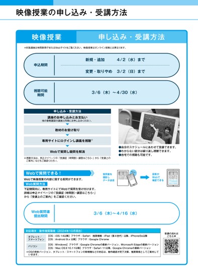 映像授業の申し込み・受講方法映像授業申し込み・受講方法*対象講座は時間割冊子またはWebサイトをご覧ください。映像授業はオンライン授業とは異なります。申込期間視聴可能期間新規・追加4/2(水)まで変更・取りやめ3/2(日)まで3/6(木)〜4/30(水)申し込み・受講方法講座のお申し込みとお支払い他の春期講習の講座と同様にお申し込みください。教材のお受け取り専用サイトにログインし講義を視聴※Webで質問し疑問を解消※視聴方法は、申込マイページの「受講証(時間割)ー講習はこちらー」から「受講上のご案内」などをご確認ください。●自分のスケジュールにあわせて受講できます。●わからない部分は繰り返し視聴できます。●自宅での視聴も可能です。Webで質問できる!Webで映像授業の内容に関する質問ができます。Web質問方法下記期間内に、専用サイトにてWebで質問を受け付けます。詳細は申込マイページの「受講証(時間割)ー講習はこちらー」から「受講上のご案内」をご確認ください。質問書を撮影しデータ送信カシャ!回答がWebで確認できるWeb質問書提出期間3/6(木)〜4/16(水)対応端末・動作推奨環境(2024年10月現在)タブレット/スマートフォン【OS:iOS14以降】ブラウザ:Safari推奨機種:iPad(第4世代)以降、iPhone5s以降【OS:Android9.x以降】ブラウザ:GoogleChromeパソコン【OS:Windows】ブラウザ:GoogleChromeの最新バージョン、MicrosoftEdgeの最新バージョン【OS:MacOSⅩ10.11以降】ブラウザ:Safari11以降、GoogleChromeの最新バージョン※OSの将来バージョン、タブレット/スマートフォンの新機種などの対応は、動作確認が完了次第、推奨環境としてご案内していきます。受講の流れはこちら▼