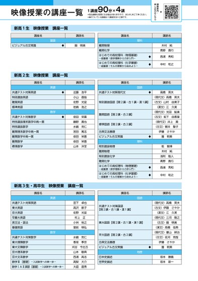 新高1生映像授業講座一覧講座名国語講師名ビジュアル古文常識園明美新高2生映像授業講座一覧講座名英語共通テスト対策英語特別選抜英語難関英語標準英語数学共通テスト対策数学特別選抜理系数学中高一貫特別選抜数学難関理系数学中高一貫難関数学中高一貫難関数学標準数学講師名近藤浩平小山直哉佐野光宜岩崎浩之依田栄喜藤野真也水嶋克仁宮田篤志依田栄喜依田栄喜山本洋至新高3生・高卒生映像授業講座一覧講座名英語共通テスト対策英語東大英語京大英語早慶大英語英文法・語法基礎英語数学共通テスト対策数学東大理類数学東大文類数学京大理系数学京大文系数学数学Ⅲ[基礎]-入試数学への第一歩-数学ⅠAⅡ演習[基礎]-入試数学への第一歩-講師名宮下卓也高沢節子佐野光宜村上正小林裕之堂前明弘水嶋克仁香坂季京刈谷今比古山本敏典西浦高志高梨大介大庭直秀講座名理科難関物理難関化学はじめての高校理科(物理基礎)-超重要!数学理解から力学入門-はじめての高校理科(化学基礎)-超重要!モルの理解から始めよう-講座名国語講師名木村純青野貴行西浦秀和中村和之講師名共通テスト対策現代文高橋英夫特別選抜国語【現2講・古1講・漢1講】難関国語【現2講・古2講】標準国語【現2講・古2講】(現代文)高橋英夫(古文)山村由美子(漢文)江久実(現代文)光田鮎美(古文)坂下由香里(現代文)井上真(古文)菅井聖子古典文法基礎ビジュアル古文常識伊藤さやか園明美理科特別選抜物理難関物理特別選抜化学難関化学はじめての高校理科(物理基礎)-超重要!数学理解から力学入門-はじめての高校理科(化学基礎)-超重要!モルの理解から始めよう-講座名国語共通テスト対策国語【現2講・古1講・漢1講】東大国語【現2講・古1講・漢1講】早大国語【現2講・古2講】乾雅博木村純浅利魁人青野貴行西浦秀和中村和之講師名(現代文)高橋英夫(古文)伊藤さやか(漢文)江久実(現代文)三河隆之(古文)園明美(漢文)髙橋佳典(現代文)菱山耕治(古文)佐河克哉古典文法基礎ビジュアル古文常識伊藤さやか園明美地歴日本史論述世界史論述坂本勝義坂本新一▶講座案内・申し込みはこちら映像授業の講座一覧1講座90分×4講*担当講師は変更になる場合がありますので、あらかじめご了承ください。*♦のついている講座は1講座90分×2講です。