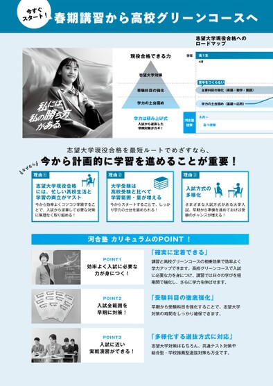 今すぐスタート!春期講習から高校グリーンコースへ志望大学現役合格へのロードマップ現役合格できる力学年高1生4月志望大学対策受験科目の強化学力の土台固め苦手をつくらない主要科目の強化(英語・数学・国語)学力の土台固め(基礎〜応用)学力は積み上げ式入試から逆算した早期対策がカギ!河合塾授業4月〜高1授業なぜな志望大学現役合格を最短ルートでめざすなら、今から計画的に学習を進めることが重要!ら理由①理由②志望大学現役合格には、忙しい高校生活と学習の両立がマスト今から効率よくコツコツ学習することで、入試から逆算して必要な対策に無理なく取り組める!大学受験は高校受験と比べて学習範囲・量が増える今からスタートすることで、しっかり学力の土台を固められる!理由③入試方式の多様化さまざまな入試方式がある大学入試。早期から準備を進めておけば受験のチャンスが増える!河合塾カリキュラムのPOINT!POINT1効率よく入試に必要な力が身につく!「確実に定着できる」講習と高校グリーンコースの相乗効果で効率よく学力アップできます。高校グリーンコースで入試に必要な力を身につけ、講習では日々の学びを短期間で強化し、さらに学力を伸ばせます。POINT2入試全範囲を早期に対策!「受験科目の徹底強化」早期から受験科目を強化することで、志望大学対策の時間をしっかり確保できます。POINT3入試に近い実戦演習ができる!「多様化する選抜方式に対応」志望大学対策はもちろん、共通テスト対策や総合型・学校推薦型選抜対策も万全です。
