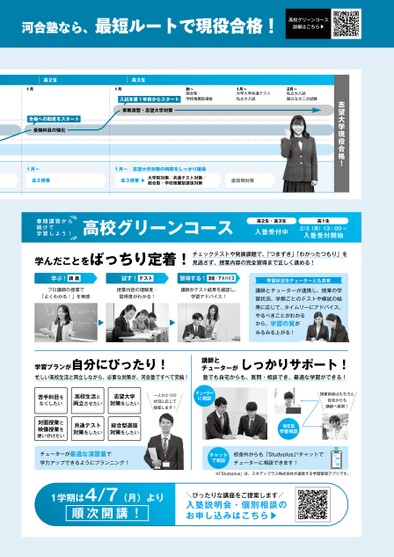 志望大学現役合格!高3生1月入試本番1年前からスタート実戦演習・志望大学対策秋〜総合型・学校推薦型選抜1月〜大学入学共通テスト私立大入試2月〜私立大入試国公立大二次試験1月〜志望大学対策の時間をしっかり確保大学別対策/共通テスト対策/総合型・学校推薦型選抜対策高3授業▶直前期対策高2生1月合格への助走をスタート受験科目の強化1月〜高2授業春期講習から続けて学習しよう!高校グリーンコース高2生・高3生入塾受付中高1生2/3(月)13:00〜入塾受付開始学んだことをばっちり定着!チェックテストや発展課題で、「つまずき」「わかったつもり」を見逃さず、授業内容の完全習得まで正しく進める!学ぶ!講義試す!テスト習得する!添削・アドバイスプロ講師の授業で「よくわかる!」を実感授業内容の理解度・習得度がわかる!講師がテスト結果を確認し、学習アドバイス!学習状況をチューターとも共有講師とチューターが連携し、授業の学習状況、学期ごとのテストや模試の結果に応じて、タイムリーにアドバイス。やるべきことがわかるから、学習の質がみるみる上がる!学習プランが自分にぴったり!忙しい高校生活と両立しながら、必要な対策が、河合塾ですべて完結!講師とチューターが塾でも自宅からも、質問・相談でき、最適な学習ができる!しっかりサポート!苦手科目をなくしたい高校生活と両立させたい志望大学対策をしたい一人ひとりの状況に応じて提案します!チューターに相談授業前後はもちろん自宅からも講師へ質問!対面授業と映像授業を使い分けたい共通テスト対策をしたい総合型選抜対策をしたいチューターが最適な演習量で学力アップできるようにプランニング!WEB学習相談チャットで相談校舎外からも「Studyplus」※チャットでチューターに相談できます!※「Studyplus」は、スタディプラス株式会社が運営する学習管理アプリです。1学期は4/7(月)より順次開講!\ぴったりな講座をご提案します/入塾説明会・個別相談のお申し込みはこちら▶河合塾なら、最短ルートで現役合格!高校グリーンコース詳細はこちら▼