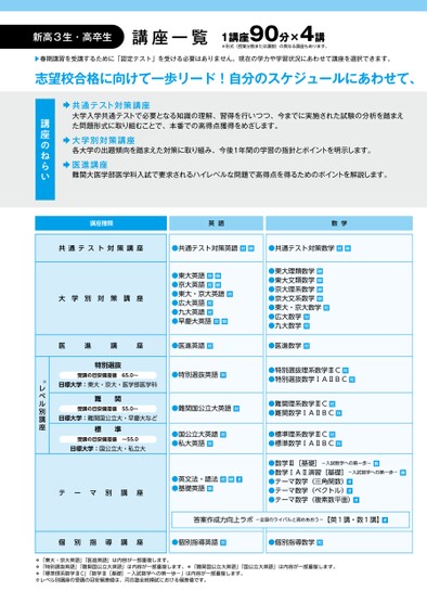 新高3生・高卒生講座一覧1講座90分×4講※形式(授業分数または講数)の異なる講座もあります。▶春期講習を受講するために「認定テスト」を受ける必要はありません。現在の学力や学習状況にあわせて講座を選択できます。志望校合格に向けて一歩リード!自分のスケジュールにあわせて、共通テスト対策講座大学入学共通テストで必要となる知識の理解、習得を行いつつ、今までに実施された試験の分析を踏まえた問題形式に取り組むことで、本番での高得点獲得をめざします。大学別対策講座各大学の出題傾向を踏まえた対策に取り組み、今後1年間の学習の指針とポイントを明示します。医進講座難関大医学部医学科入試で要求されるハイレベルな問題で高得点を得るためのポイントを解説します。講座のねらい講座種類英語数学共通テスト対策講座●共通テスト対策英語対映●共通テスト対策数学対映大学別対策講座●東大英語対映●京大英語対映●東大・京大英語対●広大英語対●九大英語対●早慶大英語対映●東大理類数学映●東大文類数学映●京大理系数学映●京大文系数学映●東大・京大数学対●広大数学対●九大数学対●特別選抜英語対●特別選抜理系数学ⅢC対●特別選抜数学ⅠAⅡBC対●難関国公立大英語対●国公立大英語対●私大英語対●難関理系数学ⅢC対●難関数学ⅠAⅡBC対●標準理系数学ⅢC対●標準数学ⅠAⅡBC対特別選抜受講の目安偏差値65.0~目標大学:東大・京大・医学部医学科難関受講の目安偏差値55.0~目標大学:難関国公立大・早慶大など標準受講の目安偏差値~55.0目標大学:国公立大・私立大※レベル別講座医進講座●医進英語対●医進数学対テーマ別講座●英文法・語法対映オ●基礎英語映●数学Ⅲ[基礎]-入試数学への第一歩-映●数学ⅠAⅡ演習[基礎]-入試数学への第一歩-映●テーマ数学(三角関数)オ●テーマ数学(ベクトル)オ●テーマ数学(複素数平面)オ答案作成力向上ラボ-全国のライバルと高めあおう-【英1講・数1講】オ個別指導講座●個別指導英語対●個別指導数学対*「東大・京大英語」「医進英語」は内容が一部重複します。*「特別選抜英語」「難関国公立大英語」は内容が一部重複します。*「難関国公立大英語」「国公立大英語」は内容が一部重複します。*「標準理系数学ⅢC」「数学Ⅲ[基礎]-入試数学への第一歩-」は内容が一部重複します。※レベル別講座の受講の目安偏差値は、河合塾全統模試における偏差値です。