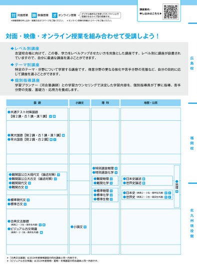 広島校福岡校北九州現役館レベル別講座志望校合格に向けて、この春、学力をレベルアップさせたい方を対象とした講座です。レベル別に講座が設置されていますので、自分に最適な講座を選ぶことができます。テーマ別講座特定のテーマ・分野について学習する講座です。得意分野の更なる強化や苦手分野の克服など、自分の目的に応じて講座を選ぶことができます。個別指導講座学習プランナー(河合塾講師)との学習カウンセリングで決定した学習内容を、個別指導員が丁寧に指導。苦手分野の克服、基礎力・応用力を養成します。国語小論文理科地歴・公民●地理対●日本史論述映●世界史論述映●日本史(新高2・3生・高卒生共通)対オ●世界史(新高2・3生・高卒生共通)対オ●特別選抜物理対●特別選抜化学対●難関物理対●難関化学対●標準物理対●標準化学対●標準生物対●共通テスト対策国語【現2講・古1講・漢1講】対映●東大国語【現2講・古1講・漢1講】映●早大国語【現2講・古2講】映オ●難関国公立大現代文(論述対策)対●難関国公立大古文(論述対策)対●難関現代文対●難関古文対●標準現代文対●標準古文対●古典文法基礎(新高2・3生・高卒生共通)対映●ビジュアル古文常識(新高1・2・3生・高卒生共通)映●小論文対*「古典文法基礎」は2024年度春期講習の同名講座と同一内容です。*「ビジュアル古文常識」は2024年度春期・夏期・冬期講習の同名講座と同一内容です。対面・映像・オンライン授業を組み合わせて受講しよう!対対面授業映映像授業オオンライン授業デジタル端末などを使ってオンライン上で受講できるライブ型の授業です。*映像授業の申し込み・受講方法は13ページをご覧ください。*オンライン授業の詳細は12ページをご覧ください。講座案内・申し込みはこちら▶