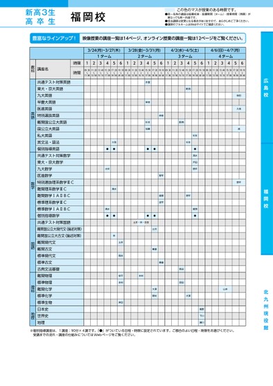 新高3生高卒生●同一名称の講座は設置校舎・設置期間(ターム)・授業時間(時限)が異なっても同一内容です。●担当講師は変更になる場合がありますので、あらかじめご了承ください。●講師のフルネームはWebサイトでご確認ください。この色のマスが授業のある時限です。永冨柴田杉本加藤●●柴田堤(英)柴田柴田久我久我浦浦野竿野竿広島校福岡校堤(英)杉本野竿杉本●清水戸田野竿龍頭●久我●●大坪清水清水●●林野竿龍頭波平重盛●●土井・林・吉田土井重盛大澤野村本村土井岡本安平本村岸田新谷原田大澤山本山本梅野下川瀬川福岡校3/24(月)~3/27(木)3/28(金)~3/31(月)4/2(水)~4/5(土)4/6(日)~4/9(水)4/6日)/(1ターム2ターム3ターム4ターム12345612345612345612345609:30〜11:0011:20〜12:5013:40〜15:1015:30〜17:0017:20〜18:5019:10〜20:4009:30〜11:0011:20〜12:5013:40〜15:1015:30〜17:0017:20〜18:5019:10〜20:4009:30〜11:0011:20〜12:5013:40〜15:1015:30〜17:0017:20〜18:5019:10〜20:4009:30〜11:0011:20〜12:5013:40〜15:1015:30〜17:0017:20〜18:5019:10〜20:40時限時間講座名教科共通テスト対策英語東大・京大英語九大英語早慶大英語医進英語特別選抜英語難関国公立大英語国公立大英語私大英語英文法・語法個別指導英語共通テスト対策数学東大・京大数学九大数学医進数学特別選抜理系数学ⅢC難関理系数学ⅢC難関数学ⅠAⅡBC標準理系数学ⅢC標準数学ⅠAⅡBC個別指導数学共通テスト対策国語難関国公立大現代文(論述対策)難関国公立大古文(論述対策)難関現代文難関古文標準現代文標準古文古典文法基礎難関物理標準物理難関化学標準化学標準生物日本史世界史地理英語数学国語理科地歴※個別指導講座は、1講座:90分×4講です。「●」がついている日程・時限に設定されています。ご都合のよい日程・時限をお選びください。受講までの流れ・講座の仕組みについてはWebページをご覧ください。●2025年度/春期講習/九州/福岡校/高3・卒生/パターン14452025_58_7_711_11_20241107181153.csv/1ページ校了時削除