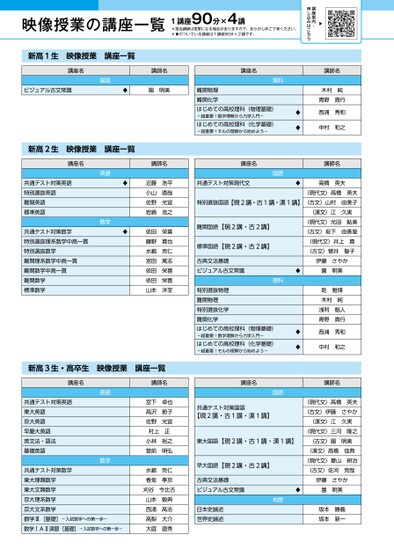 映像授業の講座一覧1講座90分×4講*担当講師は変更になる場合がありますので、あらかじめご了承ください。*♦のついている講座は1講座90分×2講です。▶講座案内・申し込みはこちら新高1生映像授業講座一覧講座名国語講師名ビジュアル古文常識園明美新高2生映像授業講座一覧講座名英語共通テスト対策英語特別選抜英語難関英語標準英語数学共通テスト対策数学特別選抜理系数学中高一貫特別選抜数学難関理系数学中高一貫難関数学中高一貫難関数学標準数学講師名近藤浩平小山直哉佐野光宜岩崎浩之依田栄喜藤野真也水嶋克仁宮田篤志依田栄喜依田栄喜山本洋至新高3生・高卒生映像授業講座一覧講座名英語共通テスト対策英語東大英語京大英語早慶大英語英文法・語法基礎英語数学共通テスト対策数学東大理類数学東大文類数学京大理系数学京大文系数学数学Ⅲ[基礎]-入試数学への第一歩-数学ⅠAⅡ演習[基礎]-入試数学への第一歩-講師名宮下卓也高沢節子佐野光宜村上正小林裕之堂前明弘水嶋克仁香坂季京刈谷今比古山本敏典西浦高志高梨大介大庭直秀講座名理科難関物理難関化学はじめての高校理科(物理基礎)-超重要!数学理解から力学入門-はじめての高校理科(化学基礎)-超重要!モルの理解から始めよう-講座名国語講師名木村純青野貴行西浦秀和中村和之講師名共通テスト対策現代文高橋英夫特別選抜国語【現2講・古1講・漢1講】難関国語【現2講・古2講】標準国語【現2講・古2講】(現代文)高橋英夫(古文)山村由美子(漢文)江久実(現代文)光田鮎美(古文)坂下由香里(現代文)井上真(古文)菅井聖子古典文法基礎ビジュアル古文常識伊藤さやか園明美理科特別選抜物理難関物理特別選抜化学難関化学はじめての高校理科(物理基礎)-超重要!数学理解から力学入門-はじめての高校理科(化学基礎)-超重要!モルの理解から始めよう-講座名国語共通テスト対策国語【現2講・古1講・漢1講】東大国語【現2講・古1講・漢1講】早大国語【現2講・古2講】乾雅博木村純浅利魁人青野貴行西浦秀和中村和之講師名(現代文)高橋英夫(古文)伊藤さやか(漢文)江久実(現代文)三河隆之(古文)園明美(漢文)髙橋佳典(現代文)菱山耕治(古文)佐河克哉古典文法基礎ビジュアル古文常識伊藤さやか園明美地歴日本史論述世界史論述坂本勝義坂本新一