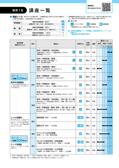 対対対対対対対対90分2講90分2講90分2講90分2講90分2講90分2講90分2講90分2講▶春期講習を受講するために「認定テスト」を受ける必要はありません。現在の学力や学習状況にあわせて講座を選択できます。●マークリスニングあり対対面授業映映像授業*映像授業の申し込み・受講方法は表紙をご覧ください。「新学年準備講座」「テーマ別講座」が進学お祝いキャンペーンの対象です。1講座500円で受講できます。授業形式授業時間講数講座レベル標準12難関34特別選抜56563412特別選抜難関標準受講の目安偏差値65.0〜目標大学:東大・京大・医学部医学科受講の目安偏差値55.0〜目標大学:東北大・難関国公立大・早慶大など受講の目安偏差値〜55.0目標大学:国公立大・私立大講座種類(講座のねらい)教科講座名●講座レベル※受講の目安偏差値は、河合塾全統模試における偏差値です。数字が大きいほど難度が高く、入試難易度の高い大学をめざす方向けの講座です。新高1生講座一覧講座案内・申し込みはこちら▶新高1準備英語-特別選抜-「論理的思考力」を学ぶ!⇒「論理的思考力」がわかる!(難関問題にチャレンジ)英語新高1準備英語-難関-「読解(英文構造と内容の理解)」と「作文(頻出表現の確認)」新高1準備英語-標準-「読解(様々な設問形式へのアプローチ)」と「英文法(中学レベルからの確認)」新高1準備数学-特別選抜-高校で差がつく「場合の数」がわかる!できる!進学お祝いキャンペーン1講座円(税込)500新学年準備講座これまでの学習内容を振り返るとともに、高校の学習につながる重点テーマを扱う講座です。数学新高1準備数学-難関-高校で差がつく「数と式・2次関数」がわかる!できる!新高1準備数学-標準-高校で差がつく「因数分解・数と式の計算」がわかる!できる!新高1準備国語-特別選抜-【現1講・古1講】高校で差がつく「評論文読解(現代文)」「語意・語法(古文)」がわかる!できる!新高1準備国語-難関・標準-【現1講・古1講】高校で差がつく「評論文読解(現代文)」「係り結び・活用形(古文)」がわかる!できる!国語理科レベル別講座現役合格に向けて、この春に学力をレベルアップさせたい方を対象とした講座です。レベル別に講座が設置されていますので、自分に最適な講座を選ぶことができます。難関物理(新高1・2生共通)対映90分4講難関化学(新高1・2生共通)対映90分4講国語ビジュアル古文常識(新高1・2・3生・高卒生共通)映90分2講進学お祝いキャンペーン1講座円(税込)500テーマ別講座特定のテーマ・分野について学習する講座です。理科はじめての高校理科(物理基礎)-超重要!数学理解から力学入門-(新高1・2生共通)対映90分2講はじめての高校理科(化学基礎)-超重要!モルの理解から始めよう-(新高1・2生共通)対映90分2講*「新高1準備国語-特別選抜-」「新高1準備国語-難関・標準-」は内容が一部重複します。*「難関物理」「難関化学」は主に学習進度の速い中高一貫校の方を対象としています。
