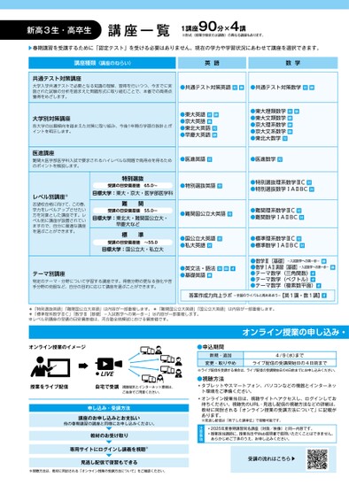 *「特別選抜英語」「難関国公立大英語」は内容が一部重複します。*「難関国公立大英語」「国公立大英語」は内容が一部重複します。*「標準理系数学ⅢC」「数学Ⅲ[基礎]-入試数学への第一歩-」は内容が一部重複します。※レベル別講座の受講の目安偏差値は、河合塾全統模試における偏差値です。オンライン授業の申し込み・※ライブ配信を受講する場合は、ライブ配信の受講開始日の4日前までにお申し込みください。●視聴方法タブレットやスマートフォン、パソコンなどの機器とインターネット環境をご準備ください。オンライン授業当日は、視聴サイトへアクセスし、ログインしてお待ちください。視聴先のURL・見逃し配信の視聴方法などの詳細は、教材に同封される「オンライン授業の受講方法について」に記載があります。※見逃し配信は「終了した講単位」で視聴可能です。2025年度春期講習同名講座(対面/映像)と同一内容です。授業担当講師に、授業当日やWeb質問書で質問いただくことはできません。あらかじめご了承のうえ、お申し込みください。注意事項●申込期間新規・追加変更・取りやめ4/9(水)までライブ配信の受講開始日の4日前まで受講の流れはこちら▼オンライン授業のイメージ授業をライブ配信ILVE自宅で受講視聴端末とインターネット環境は、ご自身でご用意ください。申し込み・受講方法講座のお申し込みとお支払い他の春期講習の講座と同様にお申し込みください。教材のお受け取り専用サイトにログインし講義を視聴※見逃し配信で復習もできる※視聴方法は、教材に同封される「オンライン授業の受講方法について」をご確認ください。新高3生・高卒生講座一覧1講座90分×4講※形式(授業分数または講数)の異なる講座もあります。▶春期講習を受講するために「認定テスト」を受ける必要はありません。現在の学力や学習状況にあわせて講座を選択できます。講座種類(講座のねらい)英語数学共通テスト対策講座大学入学共通テストで必要となる知識の理解、習得を行いつつ、今までに実施された試験の分析を踏まえた問題形式に取り組むことで、本番での高得点獲得をめざします。大学別対策講座各大学の出題傾向を踏まえた対策に取り組み、今後1年間の学習の指針とポイントを明示します。●共通テスト対策英語対映●共通テスト対策数学対映●東大英語対映●京大英語映●東北大英語対●早慶大英語映●東大理類数学対映●東大文類数学映●京大理系数学映●京大文系数学映●東北大数学対医進講座難関大医学部医学科入試で要求されるハイレベルな問題で高得点を得るためのポイントを解説します。●医進英語対●医進数学対レベル別講座※志望校合格に向けて、この春、学力をレベルアップさせたい方を対象とした講座です。レベル別に講座が設置されていますので、自分に最適な講座を選ぶことができます。特別選抜受講の目安偏差値65.0~目標大学:東大・京大・医学部医学科難関受講の目安偏差値55.0~目標大学:東北大・難関国公立大・早慶大など標準受講の目安偏差値~55.0目標大学:国公立大・私立大テーマ別講座特定のテーマ・分野について学習する講座です。得意分野の更なる強化や苦手分野の克服など、自分の目的に応じて講座を選ぶことができます。●特別選抜英語対●特別選抜理系数学ⅢC対●特別選抜数学ⅠAⅡBC対●難関国公立大英語対●難関理系数学ⅢC対●難関数学ⅠAⅡBC対●国公立大英語対●私大英語対●標準理系数学ⅢC対●標準数学ⅠAⅡBC対●英文法・語法対映オ●基礎英語映●数学Ⅲ[基礎]-入試数学への第一歩-映●数学ⅠAⅡ演習[基礎]-入試数学への第一歩-映●テーマ数学(三角関数)オ●テーマ数学(ベクトル)オ●テーマ数学(複素数平面)オ答案作成力向上ラボ-全国のライバルと高めあおう-【英1講・数1講】オ