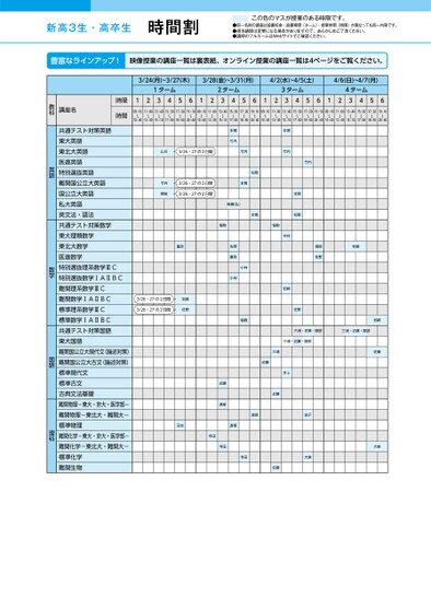 新高3生・高卒生時間割この色のマスが授業のある時限です。●同一名称の講座は設置校舎・設置期間(ターム)・授業時間(時限)が異なっても同一内容です。●担当講師は変更になる場合がありますので、あらかじめご了承ください。●講師のフルネームはWebサイトでご確認ください。豊富なラインアップ!映像授業の講座一覧は裏表紙、オンライン授業の講座一覧は4ページをご覧ください。3/24(月)~3/27(木)3/28(金)~3/31(月)4/2(水)~4/5(土)4/6(日)~4/7(月)1ターム2ターム3ターム4ターム12345612345612345612345609:10〜10:4011:00〜12:3013:40〜15:1015:30〜17:0017:20〜18:5019:10〜20:4009:10〜10:4011:00〜12:3013:40〜15:1015:30〜17:0017:20〜18:5019:10〜20:4009:10〜10:4011:00〜12:3013:40〜15:1015:30〜17:0017:20〜18:5019:10〜20:4009:10〜10:4011:00〜12:3013:40〜15:1015:30〜17:0017:20〜18:5019:10〜20:40本間竹内山川山川3/26・27の2日間竹内竹内竹内朝枝朝枝3/26・27の2日間3/26・27の2日間重政3/26・27の2日間岩崎岩崎3/26・27の2日間佐野佐野松岡本間高橋(弘)橋本間塩飽佐野重政小林小林塩飽本間竹内竹内本間松野塩飽木村岩崎佐野塩飽佐野岩崎岩崎岩崎岩崎三浦・佐藤・服部三浦・近藤・服部三浦・近藤・服部三浦・近藤・服部三浦近藤井上(興)近藤渡部金子近藤渡部玉虫渡部寺田寺田寺田大倉佐藤佐藤佐藤大倉大倉時限時間講座名教科共通テスト対策英語東大英語東北大英語医進英語特別選抜英語難関国公立大英語国公立大英語私大英語英文法・語法共通テスト対策数学東大理類数学東北大数学医進数学特別選抜理系数学ⅢC特別選抜数学ⅠAⅡBC難関理系数学ⅢC難関数学ⅠAⅡBC標準理系数学ⅢC標準数学ⅠAⅡBC共通テスト対策国語東大国語難関国公立大現代文(論述対策)難関国公立大古文(論述対策)標準現代文標準古文古典文法基礎難関物理-東大・京大・医学部-難関物理-東北大・難関大-標準物理難関化学-東大・京大・医学部-難関化学-東北大・難関大-標準化学難関生物英語数学国語理科●2025年度/春期講習/東北/仙台/高3・卒生/パターン14452025_58_2_251_11_20241107180557.csv/1ページ校了時削除