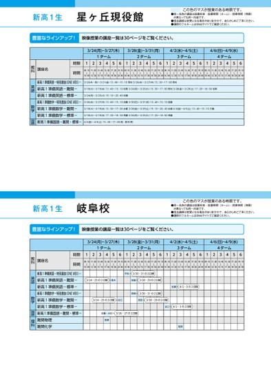 新高1生●同一名称の講座は設置校舎・設置期間(ターム)・授業時間(時限)が異なっても同一内容です。●担当講師は変更になる場合がありますので、あらかじめご了承ください。●講師のフルネームはWebサイトでご確認ください。この色のマスが授業のある時限です。3/24(月)~3/27(木)3/28(金)~3/31(月)4/2(水)~4/5(土)4/6(日)~4/9(水)1ターム2ターム3ターム4ターム12345612345612345612345609:10〜10:4011:00〜12:3013:40〜15:1015:30〜17:0017:20〜18:5019:10〜20:4009:10〜10:4011:00〜12:3013:40〜15:1015:30〜17:0017:20〜18:5019:10〜20:4009:10〜10:4011:00〜12:3013:40〜15:1015:30〜17:0017:20〜18:5019:10〜20:4009:10〜10:4011:00〜12:3013:40〜15:1015:30〜17:0017:20〜18:5019:10〜20:403/20(木・祝)〜3/21(金)13:40〜15:10笹村3/26(水)〜3/27(木)15:30〜17:00笹村3/18(火)〜3/19(水)13:40〜15:10松岡3/24(月)〜3/25(火)15:30〜17:00笹村3/28(金)〜3/29(土)17:20〜18:50松岡3/24(月)〜3/25(火)19:10〜20:40村瀬3/26(水)〜3/27(木)13:40〜15:10加藤3/30(日)〜3/31(月)13:40〜15:10加藤3/18(火)〜3/19(水)15:30〜17:00水嶋3/28(金)〜3/29(土)19:10〜20:40水嶋4/4(金)〜4/5(土)13:40〜15:10三輪3/18(火)〜3/19(水)17:20〜18:50斉藤3/24(月)〜3/25(火)17:20〜18:50斉藤4/4(金)〜4/5(土)15:30〜17:00岡・鈴木(孝)講座名時限時間新高1準備英語-特別選抜(ONEWEX)-新高1準備英語-難関-新高1準備英語-標準-新高1準備数学-特別選抜(ONEWEX)-新高1準備数学-難関-新高1準備数学-標準-新高1準備国語-難関・標準-教科英語数学国語星ヶ丘現役館新高1生岐阜校この色のマスが授業のある時限です。●同一名称の講座は設置校舎・設置期間(ターム)・授業時間(時限)が異なっても同一内容です。●担当講師は変更になる場合がありますので、あらかじめご了承ください。●講師のフルネームはWebサイトでご確認ください。3/24(月)~3/27(木)3/28(金)~3/31(月)4/2(水)~4/5(土)4/6(日)~4/9(水)1ターム2ターム3ターム4ターム12345612345612345612345609:10〜10:4011:00〜12:3013:40〜15:1015:30〜17:0017:20〜18:5019:10〜20:4009:10〜10:4011:00〜12:3013:40〜15:1015:30〜17:0017:20〜18:5019:10〜20:4009:10〜10:4011:00〜12:3013:40〜15:1015:30〜17:0017:20〜18:5019:10〜20:4009:10〜10:4011:00〜12:3013:40〜15:1015:30〜17:0017:20〜18:5019:10〜20:40市位3/30・31の2日間3/24・25の2日間青木岩崎3/28・29の2日間西畑3/30・31の2日間3/24・25の2日間谷口宮田3/28・29の2日間永瀬4/2・3の2日間佐藤・大田3/26・27の2日間西浦谷口4/2・3の2日間若原講座名時限時間新高1準備英語-特別選抜(ONEWEX)-新高1準備英語-難関-新高1準備英語-標準-新高1準備数学-特別選抜(ONEWEX)-新高1準備数学-難関-新高1準備数学-標準-新高1準備国語-難関・標準-難関物理難関化学教科英語数学国語理科豊富なラインアップ!映像授業の講座一覧は30ページをご覧ください。●2025年度/春期講習/中部/星ヶ丘/高1生/パターン14452025_58_4_439_31_20241107180904.csv/1ページ校了時削除