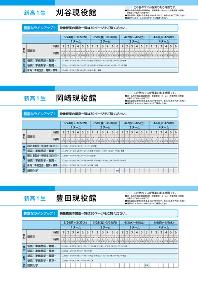 新高1生●同一名称の講座は設置校舎・設置期間(ターム)・授業時間(時限)が異なっても同一内容です。●担当講師は変更になる場合がありますので、あらかじめご了承ください。●講師のフルネームはWebサイトでご確認ください。この色のマスが授業のある時限です。3/24(月)~3/27(木)3/28(金)~3/31(月)4/2(水)~4/5(土)4/6(日)~4/9(水)1ターム2ターム3ターム4ターム12345612345612345612345610:00〜11:3011:50〜13:2014:30〜16:0016:20〜17:5018:10〜19:4020:00〜21:3010:00〜11:3011:50〜13:2014:30〜16:0016:20〜17:5018:10〜19:4020:00〜21:3010:00〜11:3011:50〜13:2014:30〜16:0016:20〜17:5018:10〜19:4020:00〜21:3010:00〜11:3011:50〜13:2014:30〜16:0016:20〜17:5018:10〜19:4020:00〜21:30時限時間講座名教科刈谷現役館新高1準備英語-難関-新高1準備数学-難関-新高1準備国語-難関・標準-3/17(月)〜3/18(火)16:20〜17:50盧山3/30(日)〜3/31(月)16:20〜17:50山本3/22(土)〜3/23(日)16:20〜17:50山田(勝)4/2(水)〜4/3(木)16:20〜17:50吉嗣3/24(月)〜3/25(火)20:00〜21:30井上(真)・横井英語数学国語新高1生岡崎現役館この色のマスが授業のある時限です。●同一名称の講座は設置校舎・設置期間(ターム)・授業時間(時限)が異なっても同一内容です。●担当講師は変更になる場合がありますので、あらかじめご了承ください。●講師のフルネームはWebサイトでご確認ください。3/24(月)~3/27(木)3/28(金)~3/31(月)4/2(水)~4/5(土)4/6(日)~4/9(水)1ターム2ターム3ターム4ターム12345612345612345612345610:00〜11:3011:50〜13:2014:30〜16:0016:20〜17:5018:10〜19:4020:00〜21:3010:00〜11:3011:50〜13:2014:30〜16:0016:20〜17:5018:10〜19:4020:00〜21:3010:00〜11:3011:50〜13:2014:30〜16:0016:20〜17:5018:10〜19:4020:00〜21:3010:00〜11:3011:50〜13:2014:30〜16:0016:20〜17:5018:10〜19:4020:00〜21:303/19(水)〜3/20(木・祝)18:10〜19:40伊藤3/17(月)〜3/18(火)20:00〜21:30永瀬4/2(水)〜4/3(木)16:20〜17:50永瀬3/26(水)〜3/27(木)16:20〜17:50山田(勝)3/22(土)〜3/23(日)14:30〜16:00河合3/28(金)〜3/29(土)16:20〜17:50河合3/22(土)〜3/23(日)16:20〜17:50日嵩・伊藤若原講座名時限時間新高1準備英語-特別選抜(ONEWEX)-新高1準備英語-難関-新高1準備数学-特別選抜(ONEWEX)-新高1準備数学-難関-新高1準備国語-難関・標準-難関化学教科英語数学国語理科豊富なラインアップ!映像授業の講座一覧は30ページをご覧ください。新高1生豊田現役館この色のマスが授業のある時限です。●同一名称の講座は設置校舎・設置期間(ターム)・授業時間(時限)が異なっても同一内容です。●担当講師は変更になる場合がありますので、あらかじめご了承ください。●講師のフルネームはWebサイトでご確認ください。3/24(月)~3/27(木)3/28(金)~3/31(月)4/2(水)~4/5(土)4/6(日)~4/9(水)1ターム2ターム3ターム4ターム12345612345612345612345610:00〜11:3011:50〜13:2014:30〜16:0016:20〜17:5018:10〜19:4020:00〜21:3010:00〜11:3011:50〜13:2014:30〜16:0016:20〜17:5018:10〜19:4020:00〜21:3010:00〜11:3011:50〜13:2014:30〜16:0016:20〜17:5018:10〜19:4020:00〜21:3010:00〜11:3011:50〜13:2014:30〜16:0016:20〜17:5018:10〜19:4020:00〜21:303/19(水)〜3/20(木・祝)16:20〜17:50山本4/4(金)〜4/5(土)16:20〜17:50山本3/30(日)〜3/31(月)14:30〜16:00森3/26(水)〜3/27(木)18:10〜19:40高田3/30(日)〜3/31(月)18:10〜19:40高田3/28(金)〜3/29(土)14:30〜16:00江澤若原講座名時限時間新高1準備英語-難関-新高1準備英語-標準-新高1準備数学-難関-新高1準備数学-標準-難関化学教科英語数学理科豊富なラインアップ!映像授業の講座一覧は30ページをご覧ください。●2025年度/春期講習/中部/刈谷/高1生/パターン14452025_58_4_448_31_20241107180904.csv/1ページ校了時削除