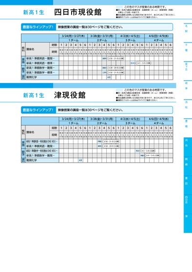 新高1生●同一名称の講座は設置校舎・設置期間(ターム)・授業時間(時限)が異なっても同一内容です。●担当講師は変更になる場合がありますので、あらかじめご了承ください。●講師のフルネームはWebサイトでご確認ください。この色のマスが授業のある時限です。名駅千種星ヶ丘岐阜浜松豊橋刈谷岡崎豊田四日市津3/24(月)~3/27(木)3/28(金)~3/31(月)4/2(水)~4/5(土)4/6(日)~4/9(水)1ターム2ターム3ターム4ターム12345612345612345612345609:30〜11:0011:20〜12:5013:50〜15:2015:40〜17:1017:30〜19:0019:20〜20:5009:30〜11:0011:20〜12:5013:50〜15:2015:40〜17:1017:30〜19:0019:20〜20:5009:30〜11:0011:20〜12:5013:50〜15:2015:40〜17:1017:30〜19:0019:20〜20:5009:30〜11:0011:20〜12:5013:50〜15:2015:40〜17:1017:30〜19:0019:20〜20:50長瀬3/30・31の2日間西畑江澤3/28・29の2日間3/30・31の2日間太田佐々木4/2・3の2日間講座名時限時間新高1準備英語-難関-新高1準備英語-標準-新高1準備数学-難関-新高1準備数学-標準-難関化学教科英語数学理科四日市現役館新高1生津現役館この色のマスが授業のある時限です。●同一名称の講座は設置校舎・設置期間(ターム)・授業時間(時限)が異なっても同一内容です。●担当講師は変更になる場合がありますので、あらかじめご了承ください。●講師のフルネームはWebサイトでご確認ください。3/24(月)~3/27(木)3/28(金)~3/31(月)4/2(水)~4/5(土)4/6(日)~4/9(水)1ターム2ターム3ターム4ターム12345612345612345612345609:30〜11:0011:20〜12:5013:50〜15:2015:40〜17:1017:30〜19:0019:20〜20:5009:30〜11:0011:20〜12:5013:50〜15:2015:40〜17:1017:30〜19:0019:20〜20:5009:30〜11:0011:20〜12:5013:50〜15:2015:40〜17:1017:30〜19:0019:20〜20:5009:30〜11:0011:20〜12:5013:50〜15:2015:40〜17:1017:30〜19:0019:20〜20:50伊藤渡部3/30・31の2日間3/28・29の2日間太田河合4/2・3の2日間斉藤4/4・5の2日間講座名時限時間新高1準備英語-特別選抜(ONEWEX)-新高1準備英語-難関-新高1準備数学-特別選抜(ONEWEX)-新高1準備数学-難関-難関化学教科英語数学理科豊富なラインアップ!映像授業の講座一覧は30ページをご覧ください。●2025年度/春期講習/中部/四日市/高1生/パターン14452025_58_4_435_31_20241107180904.csv/1ページ校了時削除