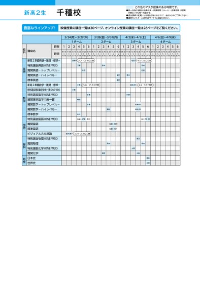 新高2生●同一名称の講座は設置校舎・設置期間(ターム)・授業時間(時限)が異なっても同一内容です。●担当講師は変更になる場合がありますので、あらかじめご了承ください。●講師のフルネームはWebサイトでご確認ください。この色のマスが授業のある時限です。3/24(月)~3/27(木)3/28(金)~3/31(月)4/2(水)~4/5(土)4/6(日)~4/9(水)1ターム2ターム3ターム4ターム12345612345612345612345609:10〜10:4011:00〜12:3013:40〜15:1015:30〜17:0017:20〜18:5019:10〜20:4009:10〜10:4011:00〜12:3013:40〜15:1015:30〜17:0017:20〜18:5019:10〜20:4009:10〜10:4011:00〜12:3013:40〜15:1015:30〜17:0017:20〜18:5019:10〜20:4009:10〜10:4011:00〜12:3013:40〜15:1015:30〜17:0017:20〜18:5019:10〜20:40長瀬3/24・25の2日間松延4/2・3の2日間玉置中野登木笹村松延青木塚田植田小倉3/24・25の2日間森本(将)森本)4/4・5の2日間小倉野村山上水嶋小倉三田村村瀬(宗)森本(将)野村安達・伊藤・野村安達・伊藤・野村鈴木(孝)3/24・25の2日間佐藤・横井佐藤・坂下宮地青野坂本窪田大髙大髙酒井北村講座名時限時間新高2準備英語-難関・標準-特別選抜英語(ONEWEX)難関英語-トップレベル-難関英語-ハイレベル-標準英語新高2準備数学-難関・標準-特別選抜理系数学中高一貫(ONEWEX)特別選抜数学(ONEWEX)難関理系数学中高一貫難関数学-トップレベル-難関数学-ハイレベル-標準数学特別選抜国語(ONEWEX)難関国語標準国語ビジュアル古文常識特別選抜物理(ONEWEX)難関物理特別選抜化学(ONEWEX)難関化学日本史世界史教科英語数学国語理科地歴千種校●2025年度/春期講習/中部/千種/高2生/パターン14452025_58_4_413_32_20241107180904.csv/1ページ校了時削除