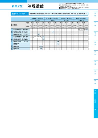 新高2生●同一名称の講座は設置校舎・設置期間(ターム)・授業時間(時限)が異なっても同一内容です。●担当講師は変更になる場合がありますので、あらかじめご了承ください。●講師のフルネームはWebサイトでご確認ください。この色のマスが授業のある時限です。名駅千種星ヶ丘岐阜浜松豊橋刈谷岡崎豊田四日市津3/24(月)~3/27(木)3/28(金)~3/31(月)4/2(水)~4/5(土)4/6(日)~4/9(水)1ターム2ターム3ターム4ターム12345612345612345612345609:30〜11:0011:20〜12:5013:50〜15:2015:40〜17:1017:30〜19:0019:20〜20:5009:30〜11:0011:20〜12:5013:50〜15:2015:40〜17:1017:30〜19:0019:20〜20:5009:30〜11:0011:20〜12:5013:50〜15:2015:40〜17:1017:30〜19:0019:20〜20:5009:30〜11:0011:20〜12:5013:50〜15:2015:40〜17:1017:30〜19:0019:20〜20:504/6・7の2日間渡辺山岸江澤嶋田渡辺3/24・25の2日間江澤山上岡・井上(淳)太田講座名時限時間新高2準備英語-難関・標準-特別選抜英語(ONEWEX)難関英語-ハイレベル-新高2準備数学-難関・標準-特別選抜数学(ONEWEX)難関数学-ハイレベル-標準数学難関国語難関化学教科英語数学国語理科津現役館●2025年度/春期講習/中部/津/高2生/パターン14452025_58_4_432_32_20241107180904.csv/1ページ校了時削除