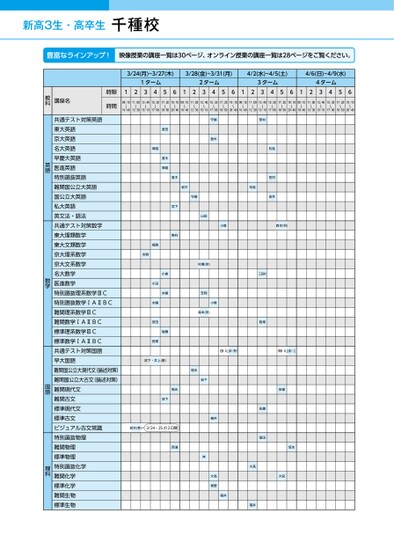 豊富なラインアップ!映像授業の講座一覧は30ページ、オンライン授業の講座一覧は28ページをご覧ください。3/24(月)~3/27(木)3/28(金)~3/31(月)4/2(水)~4/5(土)4/6(日)~4/9(水)1ターム2ターム3ターム4ターム12345612345612345612345609:10〜10:4011:00〜12:3013:40〜15:1015:30〜17:0017:20〜18:5019:10〜20:4009:10〜10:4011:00〜12:3013:40〜15:1015:30〜17:0017:20〜18:5019:10〜20:4009:10〜10:4011:00〜12:3013:40〜15:1015:30〜17:0017:20〜18:5019:10〜20:4009:10〜10:4011:00〜12:3013:40〜15:1015:30〜17:0017:20〜18:5019:10〜20:40時限時間講座名教科新高3生・高卒生千種校守屋登木笹村松延笹村金井松延小倉森本(将)金井守屋山田登木宮下野村村瀬(宗)笠岡小倉森本(将)三田村西畑塚越室田登木塚越福眞市野小倉水嶋後藤小田水嶋宮田西畑武下・井上(摩)福永坂下福永坂下鈴木(孝)鈴木)3/24・25の2日間西浦岸佐藤・井上(摩)・野村高橋・井上(摩)・江安達坂本大宮佐藤窪田大髙福井横井大髙青野福井共通テスト対策英語東大英語京大英語名大英語早慶大英語医進英語特別選抜英語難関国公立大英語国公立大英語私大英語英文法・語法共通テスト対策数学東大理類数学東大文類数学京大理系数学京大文系数学名大数学医進数学特別選抜理系数学ⅢC特別選抜数学ⅠAⅡBC難関理系数学ⅢC難関数学ⅠAⅡBC標準理系数学ⅢC標準数学ⅠAⅡBC共通テスト対策国語早大国語難関国公立大現代文(論述対策)難関国公立大古文(論述対策)難関現代文難関古文標準現代文標準古文ビジュアル古文常識特別選抜物理難関物理標準物理特別選抜化学難関化学標準化学難関生物標準生物英語数学国語理科●2025年度/春期講習/中部/千種/高3・卒生/パターン14452025_58_4_413_11_20241107180904.csv/1ページ校了時削除