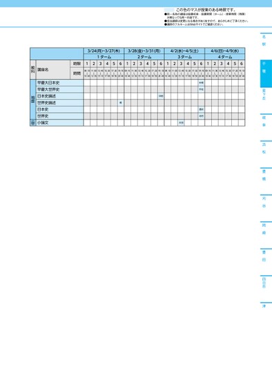 この色のマスが授業のある時限です。●同一名称の講座は設置校舎・設置期間(ターム)・授業時間(時限)が異なっても同一内容です。●担当講師は変更になる場合がありますので、あらかじめご了承ください。●講師のフルネームはWebサイトでご確認ください。名駅千種星ヶ丘岐阜浜松豊橋刈谷岡崎豊田四日市津3/24(月)~3/27(木)3/28(金)~3/31(月)4/2(水)~4/5(土)4/6(日)~4/9(水)1ターム2ターム3ターム4ターム12345612345612345612345609:10〜10:4011:00〜12:3013:40〜15:1015:30〜17:0017:20〜18:5019:10〜20:4009:10〜10:4011:00〜12:3013:40〜15:1015:30〜17:0017:20〜18:5019:10〜20:4009:10〜10:4011:00〜12:3013:40〜15:1015:30〜17:0017:20〜18:5019:10〜20:4009:10〜10:4011:00〜12:3013:40〜15:1015:30〜17:0017:20〜18:5019:10〜20:40時限時間中垣堤中垣平松酒井北村大田早慶大日本史早慶大世界史日本史論述世界史論述日本史世界史小論文地歴小論文講座名教科●2025年度/春期講習/中部/千種/高3・卒生/パターン14452025_58_4_413_11_20241107180904.csv/2ページ校了時削除