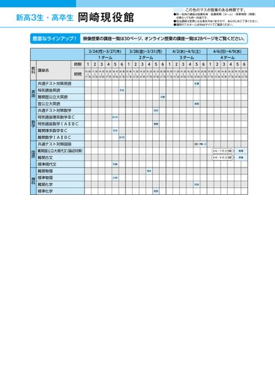 新高3生・高卒生●同一名称の講座は設置校舎・設置期間(ターム)・授業時間(時限)が異なっても同一内容です。●担当講師は変更になる場合がありますので、あらかじめご了承ください。●講師のフルネームはWebサイトでご確認ください。この色のマスが授業のある時限です。3/24(月)~3/27(木)3/28(金)~3/31(月)4/2(水)~4/5(土)4/6(日)~4/9(水)1ターム2ターム3ターム4ターム12345612345612345612345610:00〜11:3011:50〜13:2014:30〜16:0016:20〜17:5018:10〜19:4020:00〜21:3010:00〜11:3011:50〜13:2014:30〜16:0016:20〜17:5018:10〜19:4020:00〜21:3010:00〜11:3011:50〜13:2014:30〜16:0016:20〜17:5018:10〜19:4020:00〜21:3010:00〜11:3011:50〜13:2014:30〜16:0016:20〜17:5018:10〜19:4020:00〜21:30市位佐々木佐々木竹内平野小林中野河合福眞荒木若原永瀬渡邉日嵩・伊藤・江花田4/6・7の2日間高橋高橋4/8・9の2日間伊藤伊藤講座名時限時間共通テスト対策英語特別選抜英語難関国公立大英語国公立大英語共通テスト対策数学特別選抜理系数学ⅢC特別選抜数学ⅠAⅡBC難関理系数学ⅢC難関数学ⅠAⅡBC共通テスト対策国語難関国公立大現代文(論述対策)難関古文標準現代文難関物理標準物理難関化学標準化学教科英語数学国語理科岡崎現役館●2025年度/春期講習/中部/岡崎/高3・卒生/パターン14452025_58_4_450_11_20241107180904.csv/1ページ校了時削除