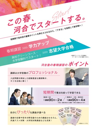 ※高校グリーンコースの詳細は、17・18ページをご確認ください。河合塾の春期講習のポイント講師は大学受験のプロフェッショナル入試問題を熟知した経験豊富な講師陣が、キミを合格に導く!自分にぴったりな講座が選べる基礎の定着や苦手分野克服のための講座はもちろん、共通テスト対策・大学別対策講座なども充実!※形式(授業分数または講数)の異なる講座もあります。短期間で要点を絞って学習できる1講座90分×2講【新高1生】1講座90分×4講【新高2・3生・高卒生】※写真はイメージです。この、河合でスタートする。春短期間で各科目の重要ポイントを押さえられるから、「できる」を実感して新学期へ!