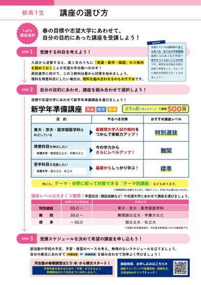 新高1生講座の選び方Letʼs講座選択春の目標や志望大学にあわせて、自分の目的にあった講座を受講しよう!STEP1受講する科目を考えよう!入試から逆算すると、高1生のうちに「英語・数学・国語」の3教科を固めておくことが志望大学合格へのカギ!高校進学に向けて、この3教科は春から対策を始めましょう。理科を得意科目にしたい場合は、理科を組み合わせるのもおすすめです。STEP2自分の目的にあわせ、講座を組み合わせて選択しよう!point共通テストの出題範囲の多くは高1生・高2生の学習範囲。基礎となる高1生の学習で苦手をつくらないことが大切です。高校生活が始まる前に先取り学習をして、スムーズに高校の学習をスタートさせましょう!目標や志望大学にあわせて新学年準備講座を選びましょう!新学年準備講座英語数学国語1講座500円(税込)目的やるべき対策おすすめ講座レベル東大・京大・医学部医学科をめざしている最難関大学入試の傾向をつかんで実戦力アップ!特別選抜得意科目を伸ばしたい目標大学:難関国公立大・早慶大など今の学力からさらにレベルアップ!苦手科目を克服したい目標大学:国公立大・私立大基礎からしっかり学ぶ!難関標準他にも、テーマ・分野に絞って対策できる「テーマ別講座」などもあります。※春期講習を受講するために「認定テスト」を受ける必要はありません。講座レベルは大きく3種類!学習状況(模試成績など)や志望大学にあわせて講座を選びましょう。受講の目安偏差値目標大学特別選抜難関標準65.0〜55.0〜〜55.0東大・京大・医学部医学科難関国公立大・早慶大など国公立大・私立大※受講の目安偏差値は、河合塾全統模試における偏差値です。STEP3受講スケジュールを決めて希望の講座を申し込もう!部活動や学校の予定、予習・復習のペースを考え、無理のないスケジュールを立てましょう。自分の都合にあわせてやを組み合わせて効率よく学びましょう!対面授業映像授業河合塾の春期講習は3/5(木)から順次スタート!学習効果を高めるための「予習」ができるよう受講開始日の7日前までには申し込もう。講座検索、お申し込みはこちら▶講座ラインアップや設置校舎、授業形式、日程はWebサイトでチェック!