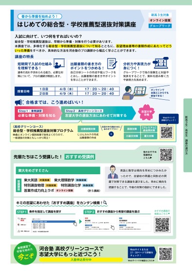 新高3生・高卒生講座の選び方春から準備を始めよう!はじめての総合型・学校推薦型選抜対策講座新高3生対象オンライン授業グループワーク入試に向けて、いつ何をすればいいの?総合型・学校推薦型選抜は、早期から準備・対策を行う必要があります。本講座では、多様化する総合型・学校推薦型選抜について知るとともに、志望理由書等の書類作成にあたってどういった準備をすべきか、具体的な方法を河合塾のプロ講師から幅広く学ぶことができます。講座の特長短期間で入試の仕組みを理解できる!選考の流れや求められる能力、必要な対策について、プロの講師が解説します。出願書類の書き方のポイントをつかめる!自己分析シートの作成や個人ワークをとおし、出願書類の書き方やポイントを学ぶことができます。分析力や表現力が身につく!グループワークで他の受験生と対話や発表をすることで、資料を読み解く力や表現力を高めます。授業日時1日目2日目4/8(水)4/9(木)17:20〜20:4017:20〜20:40合格までは、こう進めばいい!オンラインで全国どこからでも参加できる!Step1:春期講習必要な準備・対策を知るStep2:高校グリーンコース志望大学の選抜方法にあわせて対策する志望大学合格Webサイトで詳細をチェック!〈高校グリーンコース〉総合型・学校推薦型選抜対策プログラム映像とオンライン個別指導で効率よく行うので、一般選抜の対策ともしっかり両立!出願書類対策志望大学の選抜方式にあわせてプラス!じぶんカルテの作成出願書類の作成+面接対策【プレミアム】過去問対策小論文対策慶大対策先輩たちはこう受講した!おすすめ受講例他のおすすめ受講例はこちら▲英語と数学は傾向を早めにつかみたかったので、志望校の問題と同形式の問題で対策できる講座を選びました。早めに傾向を把握することで、今後の対策の指針にできました。対面授業映像授業映像授業計5講座東大英語東大理類数学特別選抜物理特別選抜化学答案作成力向上ラボオンライン授業対面授業受講講座東大をめざすEさんキミの志望にあわせた「おすすめ講座」をカンタン検索!STEP1条件を指定して講座を探すSTEP2おすすめ講座から希望の講座を選ぶおすすめ講座の検索はこちら▲東京大学<理類>対策東京大学<文類>対策京都大学<理系>対策京都大学<文系>対策⁝総合型・学校推薦型選抜対策春期講習で学習を始めた今こそ河合塾高校グリーンコースで志望大学にもっと近づこう!入塾申込受付中Webサイトまたは17・18ページで詳細をチェック!Webサイトでの確認はこちら▶