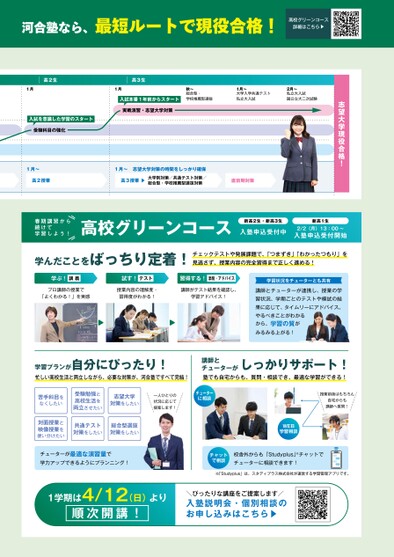 志望大学現役合格!河合塾なら、最短ルートで現役合格!学んだことをばっちり定着!学習プランが自分にぴったり!しっかりサポート!高校グリーンコース春期講習から続けて学習しよう!高3生1月1月秋〜1月〜2月〜高2生入試を意識した学習のスタート入試本番1年前からスタート総合型・学校推薦型選抜大学入学共通テスト私立大入試私立大入試国公立大二次試験1月〜1月〜志望大学対策の時間をしっかり確保受験科目の強化実戦演習・志望大学対策直前期対策高校グリーンコース詳細はこちら▼\ぴったりな講座をご提案します/入塾説明会・個別相談のお申し込みはこちら▶1学期は4/12(日)より順次開講!入塾申込受付中新高2生・新高3生2/2(月)13:00〜入塾申込受付開始新高1生プロ講師の授業で「よくわかる!」を実感授業内容の理解度・習得度がわかる!講師がテスト結果を確認し、学習アドバイス!学習状況をチューターとも共有講師とチューターがチェックテストや発展課題で、「つまずき」「わかったつもり」を見逃さず、授業内容の完全習得まで正しく進める!忙しい高校生活と両立しながら、必要な対策が、河合塾ですべて完結!塾でも自宅からも、質問・相談でき、最適な学習ができる!チューターが最適な演習量で学力アップできるようにプランニング!校舎外からも「Studyplus」※チャットでチューターに相談できます!※「Studyplus」は、スタディプラス株式会社が運営する学習管理アプリです。苦手科目をなくしたい受験勉強と高校生活を両立させたい志望大学対策をしたい対面授業と映像授業を使い分けたい共通テスト対策をしたい総合型選抜対策をしたい講師とチューターが連携し、授業の学習状況、学期ごとのテストや模試の結果に応じて、タイムリーにアドバイス。やるべきことがわかるから、学習の質がみるみる上がる!一人ひとりの状況に応じて提案します!授業前後はもちろん自宅からも講師へ質問!チャットで相談チューターに相談WEB学習相談習得する!添削・アドバイス学ぶ!講義試す!テスト高2授業大学別対策/共通テスト対策/総合型・学校推薦型選抜対策高3授業▶