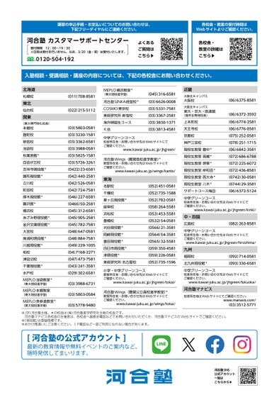 講習の申込手続・お支払いについてのお問い合わせは、下記フリーダイヤルにご連絡ください。各校舎・教室の受付時間はWebサイトよりご確認ください。河合塾カスタマーサポートセンター受付時間12:00〜19:30※日祝は受付を行いません。なお、3/20(金・祝)は受付いたします。0120-50●4-19●2よくあるご質問はこちら▶各校舎・教室の詳細はこちら▶入塾相談・受講相談・講座の内容については、下記の各校舎にお問い合わせください。北海道札幌校東北仙台校関東〈東大専門特化校舎〉本郷校麹町校新宿校池袋校秋葉原館*自由が丘校吉祥寺現役館*調布現役館*立川校町田校厚木現役館*藤沢館*横浜校あざみ野現役館*金沢文庫現役館*大宮校南浦和現役館*川越現役館*柏校津田沼校千葉現役館*水戸校MEPLO池袋教室*(東大現役進学塾)MEPLO本郷教室(東大現役進学塾)MEPLO表参道教室*(東大現役進学塾)(011)708-8581(022)215-5112(03)5803-0581(03)3230-1581(03)3362-6581(03)3988-0581(03)5825-1581(03)5726-3261(0422)23-6581(042)440-2581(042)526-0581(042)724-7581(046)227-6581(0466)50-2581(045)312-6581(045)905-2581(045)782-7581(048)647-0581(048)884-7581(049)229-1005(04)7168-2271(047)473-7581(043)241-3581(029)302-6581(03)3988-6731(03)5803-0584(03)5778-9480MEPLO横浜教室*(東大現役進学塾)河合塾SⅠNKA経堂校*COSMO東京校美術研究所新宿校海外帰国生コースK会(045)316-6581(03)6626-0008(03)5331-7581(03)3367-2581(03)3830-1371(03)3813-4581中学グリーンコース校舎所在地・お問い合わせ先はWebサイトにてご確認ください。www.kawai-juku.ac.jp/jhgreen/河合塾Winɡs(難関高校進学教室)*教室所在地・お問い合わせ先はWebサイトにてご確認ください。www.kawai-juku.ac.jp/winɡs/kanto/東海名駅校千種校星ヶ丘現役館*岐阜校浜松校豊橋校刈谷現役館*岡崎現役館*豊田現役館*四日市現役館*津現役館*美術研究所名古屋校(052)451-0581(052)735-1588(052)782-0581(058)264-5581(053)453-5581(0532)54-0581(0566)21-3581(0564)54-3581(0565)32-5581(059)350-4581(059)226-0581(052)735-1596小学・中学グリーンコース教室所在地・お問い合わせ先はWebサイトにてご確認ください。www.kawai-juku.ac.jp/jhɡreen/tokai/河合塾Winɡs(難関公立高校進学教室)*教室所在地・お問い合わせ先はWebサイトにてご確認ください。www.kawai-juku.ac.jp/winɡs/tokai/(06)6375-8581(06)6372-3592近畿大阪北キャンパス大阪校大阪北キャンパス東大・京大・医進館(高卒生専用校舎)上本町校天王寺校京都校神戸三宮校現役生教室豊中*現役生教室高槻*現役生教室堺東*現役生教室岸和田*現役生教室西大寺*現役生教室八木*サポートコース梅田中学グリーンコース校舎所在地・お問い合わせ先はWebサイトにてご確認ください。中・四国広島校(06)6774-2581(06)6776-0581(075)252-0581(078)251-1715(06)6842-3581(072)686-6788(072)225-6072(072)436-8581(0742)30-0581(0744)29-3581(06)6372-5124www.kawai-juku.ac.jp/jhɡreen/kinki/(082)263-8581中学グリーンコース校舎所在地・お問い合わせ先はWebサイトにてご確認ください。www.kawai-juku.ac.jp/jhɡreen/hiroshima/九州福岡校北九州現役館*中学グリーンコース校舎所在地・お問い合わせ先はWebサイトにてご確認ください。河合塾マナビス校舎所在地はWebサイトにてご確認ください。(092)714-0581(093)330-6581www.kawai-juku.ac.jp/jhɡreen/fukuoka/www.manavis.com/(03)3512-5771※(学)河合塾主催。*の校舎は(株)河合塾進学研究社主催の校舎です。河合塾マナビス各校舎の主催者は、各校舎へ直接お電話などでお問い合わせいただくか、河合塾マナビスのWebサイトでご確認ください。※「現役館」は登録商標です。※おかけ間違いにご注意ください。ⅠP電話など一部ご利用になれない場合があります。河合塾SNS公式アカウント一覧はこちらから▶