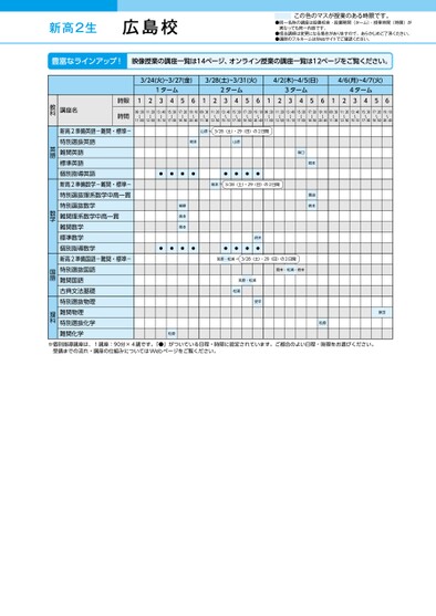 新高2生●同一名称の講座は設置校舎・設置期間(ターム)・授業時間(時限)が異なっても同一内容です。●担当講師は変更になる場合がありますので、あらかじめご了承ください。●講師のフルネームはWebサイトでご確認ください。この色のマスが授業のある時限です。3/24(火)~3/27(金)3/28(土)~3/31(火)4/2(木)~4/5(日)4/6(月)~4/7(火)1ターム2ターム3ターム4ターム12345612345612345612345609:30〜11:0011:20〜12:5013:40〜15:1015:30〜17:0017:20〜18:5019:10〜20:4009:30〜11:0011:20〜12:5013:40〜15:1015:30〜17:0017:20〜18:5019:10〜20:4009:30〜11:0011:20〜12:5013:40〜15:1015:30〜17:0017:20〜18:5019:10〜20:4009:30〜11:0011:20〜12:5013:40〜15:1015:30〜17:0017:20〜18:5019:10〜20:40山添3/28(土)・29(日)の2日間岡本山添●●●●●●●●鳥本3/28(土)・29(日)の2日間樋原森本鳥本●●●●●●●●府木坂口岡本黒田森本莵原・松浦3/28(土)・29(日)の2日間岡本・松浦・岩本莵原・松浦松浦安平松原原田松原講座名時限時間新高2準備英語-難関・標準-特別選抜英語難関英語標準英語個別指導英語新高2準備数学-難関・標準-特別選抜理系数学中高一貫特別選抜数学難関理系数学中高一貫難関数学標準数学個別指導数学新高2準備国語-難関・標準-特別選抜国語難関国語古典文法基礎特別選抜物理難関物理特別選抜化学難関化学教科英語数学国語理科※個別指導講座は、1講座:90分×4講です。「●」がついている日程・時限に設定されています。ご都合のよい日程・時限をお選びください。受講までの流れ・講座の仕組みについてはWebページをご覧ください。広島校●2026年度/春期講習/広島/広島校/高2生/パターン14452026_58_6_611_32_20251031151452.csv/1ページ校了時削除
