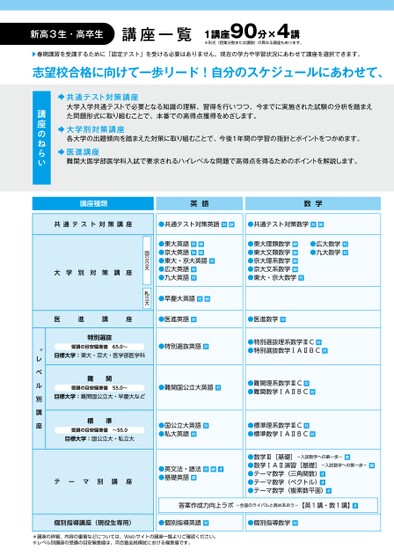 新高3生・高卒生講座一覧1講座90分×4講※形式(授業分数または講数)の異なる講座もあります。▶春期講習を受講するために「認定テスト」を受ける必要はありません。現在の学力や学習状況にあわせて講座を選択できます。志望校合格に向けて一歩リード!自分のスケジュールにあわせて、共通テスト対策講座大学入学共通テストで必要となる知識の理解、習得を行いつつ、今までに実施された試験の分析を踏まえた問題形式に取り組むことで、本番での高得点獲得をめざします。大学別対策講座各大学の出題傾向を踏まえた対策に取り組むことで、今後1年間の学習の指針とポイントをつかめます。医進講座難関大医学部医学科入試で要求されるハイレベルな問題で高得点を得るためのポイントを解説します。講座のねらい●東大理類数学映●広大数学対●東大文類数学映●九大数学対●京大理系数学映●京大文系数学映●東大・京大数学対●東大英語対映●京大英語対映●東大・京大英語対●広大英語対●九大英語対●早慶大英語対映国公立大私立大大学別対策講座講座種類英語数学共通テスト対策講座●共通テスト対策英語対映●共通テスト対策数学対映医進講座●医進英語対●医進数学対※レベル別講座特別選抜受講の目安偏差値65.0~目標大学:東大・京大・医学部医学科難関受講の目安偏差値55.0~目標大学:難関国公立大・早慶大など標準受講の目安偏差値~55.0目標大学:国公立大・私立大●特別選抜英語対●特別選抜理系数学ⅢC対●特別選抜数学ⅠAⅡBC対●難関国公立大英語対●難関理系数学ⅢC対●難関数学ⅠAⅡBC対●国公立大英語対●私大英語対●標準理系数学ⅢC対●標準数学ⅠAⅡBC対テーマ別講座●英文法・語法対映オ●基礎英語映●数学Ⅲ[基礎]-入試数学への第一歩-映●数学ⅠAⅡ演習[基礎]-入試数学への第一歩-映●テーマ数学(三角関数)オ●テーマ数学(ベクトル)オ●テーマ数学(複素数平面)オ答案作成力向上ラボ-全国のライバルと高めあおう-【英1講・数1講】オ個別指導講座(現役生専用)●個別指導英語対●個別指導数学対*講座の詳細、内容の重複などについては、Webサイトの講座一覧よりご確認ください。※レベル別講座の受講の目安偏差値は、河合塾全統模試における偏差値です。