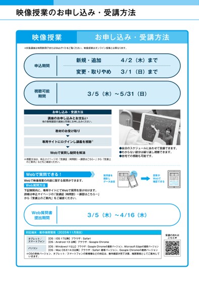*対象講座は時間割冊子またはWebサイトをご覧ください。映像授業はオンライン授業とは異なります。※OSの将来バージョン、タブレット/スマートフォンの新機種などの対応は、動作確認が完了次第、推奨環境としてご案内していきます。対応端末・動作推奨環境(2025年11月現在)タブレット/スマートフォン【OS:iOS17以降】ブラウザ:Safari【OS:Android13以降】ブラウザ:GoogleChromeパソコン【OS:Windows11以上】ブラウザ:GoogleChromeの最新バージョン、MicrosoftEdgeの最新バージョン【OS:MacOSⅩ14.0以降】ブラウザ:Safari最新バージョン、GoogleChromeの最新バージョン申込期間視聴可能期間新規・追加4/2(木)まで変更・取りやめ3/1(日)まで3/5(木)〜5/31(日)※視聴方法は、申込マイページの「受講証(時間割)-講習はこちら-」から「受講上のご案内」などをご確認ください。教材のお受け取りWebで質問し疑問を解消専用サイトにログインし講義を視聴※講座のお申し込みとお支払い他の春期講習の講座と同様にお申し込みください。お申し込み・受講方法Webで映像授業の内容に関する質問ができます。Webで質問できる!質問書を撮影しデータ送信回答がWebで確認できる下記期間内に、専用サイトにてWebで質問を受け付けます。詳細は申込マイページの「受講証(時間割)-講習はこちら-」から「受講上のご案内」をご確認ください。Web質問方法カシャ!お申し込み・受講方法映像授業Web質問書提出期間3/5(木)〜4/16(木)●自分のスケジュールにあわせて受講できます。●わからない部分は繰り返し視聴できます。●自宅での視聴も可能です。映像授業のお申し込み・受講方法受講の流れはこちら▼
