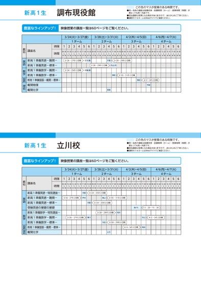 新高1生●同一名称の講座は設置校舎・設置期間(ターム)・授業時間(時限)が異なっても同一内容です。●担当講師は変更になる場合がありますので、あらかじめご了承ください。●講師のフルネームはWebサイトでご確認ください。この色のマスが授業のある時限です。新高1生●同一名称の講座は設置校舎・設置期間(ターム)・授業時間(時限)が異なっても同一内容です。●担当講師は変更になる場合がありますので、あらかじめご了承ください。●講師のフルネームはWebサイトでご確認ください。この色のマスが授業のある時限です。調布現役館講座名時限時間新高1準備英語-難関-新高1準備英語-標準-新高1準備数学-難関-新高1準備数学-標準-新高1準備国語-難関・標準-難関物理難関化学3/24(火)~3/27(金)3/28(土)~3/31(火)4/2(木)~4/5(日)4/6(月)~4/7(火)1ターム2ターム3ターム4ターム12345612345612345612345609:00〜10:3010:50〜12:2013:20〜14:5015:10〜16:4017:00〜18:3018:50〜20:2009:00〜10:3010:50〜12:2013:20〜14:5015:10〜16:4017:00〜18:3018:50〜20:2009:00〜10:3010:50〜12:2013:20〜14:5015:10〜16:4017:00〜18:3018:50〜20:2009:00〜10:3010:50〜12:2013:20〜14:5015:10〜16:4017:00〜18:3018:50〜20:203/26・27の2日間吉川(量)中園3/28・29の2日間3/28・29の2日間内山(洋)3/24・25の2日間佐藤(健)窪田3/30・31の2日間税田4/2・3の2日間宇都西尾立川校講座名時限時間新高1準備英語-特別選抜-新高1準備英語-難関-新高1準備英語-標準-受験英語の基礎の基礎新高1準備数学-特別選抜-新高1準備数学-難関-新高1準備数学-標準-新高1準備国語-難関・標準-難関化学3/24(火)~3/27(金)3/28(土)~3/31(火)4/2(木)~4/5(日)4/6(月)~4/7(火)1ターム2ターム3ターム4ターム12345612345612345612345609:00〜10:3010:50〜12:2013:20〜14:5015:10〜16:4017:00〜18:3018:50〜20:2009:00〜10:3010:50〜12:2013:20〜14:5015:10〜16:4017:00〜18:3018:50〜20:2009:00〜10:3010:50〜12:2013:20〜14:5015:10〜16:4017:00〜18:3018:50〜20:2009:00〜10:3010:50〜12:2013:20〜14:5015:10〜16:4017:00〜18:3018:50〜20:203/26・27の2日間中園村3/24・25の2日間高山3/30・31の2日間中園3/24・25の2日間3/28・29の2日間相川森(千)13:20~15:303/26・27の2日間横川杉山4/2・3の2日間今田3/28・29の2日間4/4・5の2日間和田小竹教科英語数学国語理科教科英語数学国語理科●2026年度/春期講習/東日本/調布/高1生/パターン14452026_58_3_367_31_20251104190004.csv/1ページ校了時削除