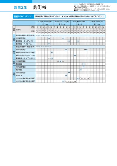 新高2生●同一名称の講座は設置校舎・設置期間(ターム)・授業時間(時限)が異なっても同一内容です。●担当講師は変更になる場合がありますので、あらかじめご了承ください。●講師のフルネームはWebサイトでご確認ください。この色のマスが授業のある時限です。3/24(火)~3/27(金)3/28(土)~3/31(火)4/2(木)~4/5(日)4/6(月)~4/7(火)1ターム2ターム3ターム4ターム12345612345612345612345609:00〜10:3010:50〜12:2013:20〜14:5015:10〜16:4017:00〜18:3018:50〜20:2009:00〜10:3010:50〜12:2013:20〜14:5015:10〜16:4017:00〜18:3018:50〜20:2009:00〜10:3010:50〜12:2013:20〜14:5015:10〜16:4017:00〜18:3018:50〜20:2009:00〜10:3010:50〜12:2013:20〜14:5015:10〜16:4017:00〜18:3018:50〜20:203/15(日)13:20〜16:50青柳佐藤是枝3/22(日)09:00〜12:30田井押田木村(智)押田広瀬伊東(敦)夏川佐々木(吾)川野・園・宮本成合川野・小野木杉山杉山樹葉安東杉山4/2・3の2日間安東3/30・31の2日間講座名時限時間新高2準備英語-難関・標準-特別選抜英語難関英語-トップレベル-難関英語-ハイレベル-新高2準備数学-難関・標準-特別選抜数学難関理系数学中高一貫-アドバンスト(速習)-難関数学中高一貫-アドバンスト-難関数学-トップレベル-特別選抜国語難関国語特別選抜物理難関物理特別選抜化学難関化学はじめての高校理科(物理基礎)はじめての高校理科(化学基礎)教科英語数学国語理科麹町校●2026年度/春期講習/東日本/麹町/高2生/パターン14452026_58_3_328_32_20251104141807.csv/1ページ校了時削除