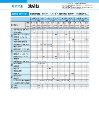 新高2生●同一名称の講座は設置校舎・設置期間(ターム)・授業時間(時限)が異なっても同一内容です。●担当講師は変更になる場合がありますので、あらかじめご了承ください。●講師のフルネームはWebサイトでご確認ください。この色のマスが授業のある時限です。3/24(火)~3/27(金)3/28(土)~3/31(火)4/2(木)~4/5(日)4/6(月)~4/7(火)1ターム2ターム3ターム4ターム12345612345612345612345609:00〜10:3010:50〜12:2013:20〜14:5015:10〜16:4017:00〜18:3018:50〜20:2009:00〜10:3010:50〜12:2013:20〜14:5015:10〜16:4017:00〜18:3018:50〜20:2009:00〜10:3010:50〜12:2013:20〜14:5015:10〜16:4017:00〜18:3018:50〜20:2009:00〜10:3010:50〜12:2013:20〜14:5015:10〜16:4017:00〜18:3018:50〜20:203/20(金・祝)13:20〜16:50村上丹羽東内川原岩間矢作幸長矢作高山9:00~11:10柳沢3/26・27の2日間生田相川相川3/22(日)13:20〜16:50中林・上田川野・酒井(完)・豊崎木村・小野木松藤・隼坂中村(隆)柳沢刈谷秦野福永長谷川中野(喜)今枝岡島中野(喜)3/24・25の2日間中野(喜)3/30・31の2日間3/28(土)・29(日)17:00~18:30岡島3/30(月)・31(火)17:00~18:30岡島)3/29(日17:018:303/0月〜3/31(火):0〜1830岡島岡島大内加藤時限時間講座名教科新高2準備英語-難関・標準-特別選抜英語難関英語-トップレベル-難関英語-ハイレベル-標準英語受験英語の基礎の基礎新高2準備数学-難関・標準-特別選抜数学難関理系数学中高一貫-アドバンスト(速習)-難関数学中高一貫-アドバンスト-難関数学-トップレベル-難関数学-ハイレベル-標準数学新高2準備国語-難関・標準-特別選抜国語難関国語標準国語特別選抜物理難関物理特別選抜化学難関化学はじめての高校理科(物理基礎)はじめての高校理科(化学基礎)日本史世界史英語数学国語理科地歴池袋校●2026年度/春期講習/東日本/池袋/高2生/パターン14452026_58_3_314_32_20251104185828.csv/1ページ校了時削除