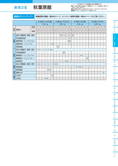 新高2生●同一名称の講座は設置校舎・設置期間(ターム)・授業時間(時限)が異なっても同一内容です。●担当講師は変更になる場合がありますので、あらかじめご了承ください。●講師のフルネームはWebサイトでご確認ください。この色のマスが授業のある時限です。麹町新宿池袋秋葉原自由が丘吉祥寺調布立川町田厚木藤沢横浜あざみ野金沢文庫大宮南浦和川越柏津田沼千葉水戸3/24(火)~3/27(金)3/28(土)~3/31(火)4/2(木)~4/5(日)4/6(月)~4/7(火)1ターム2ターム3ターム4ターム12345612345612345612345609:00〜10:3010:50〜12:2013:20〜14:5015:10〜16:4017:00〜18:3018:50〜20:2009:00〜10:3010:50〜12:2013:20〜14:5015:10〜16:4017:00〜18:3018:50〜20:2009:00〜10:3010:50〜12:2013:20〜14:5015:10〜16:4017:00〜18:3018:50〜20:2009:00〜10:3010:50〜12:2013:20〜14:5015:10〜16:4017:00〜18:3018:50〜20:20清川3/28・29の2日間田口髙橋(保)村上飯田伊東(鋼)土岐田成川3/22(日)13:20〜16:50高梨(大)3/20(金・祝)13:20〜16:50一瀬・酒井(完)篠原・隼坂大内平尾(雅)平(雅)渡辺柳沢一瀬・酒井(完)大澤講座名時限時間新高2準備英語-難関・標準-特別選抜英語難関英語-トップレベル-難関英語-ハイレベル-標準英語新高2準備数学-難関・標準-特別選抜数学難関数学-トップレベル-難関数学-ハイレベル-標準数学新高2準備国語-難関・標準-難関国語標準国語難関化学日本史世界史教科英語数学国語理科地歴秋葉原館●2026年度/春期講習/東日本/秋葉原/高2生/パターン14452026_58_3_368_32_20251106172144.csv/1ページ校了時削除