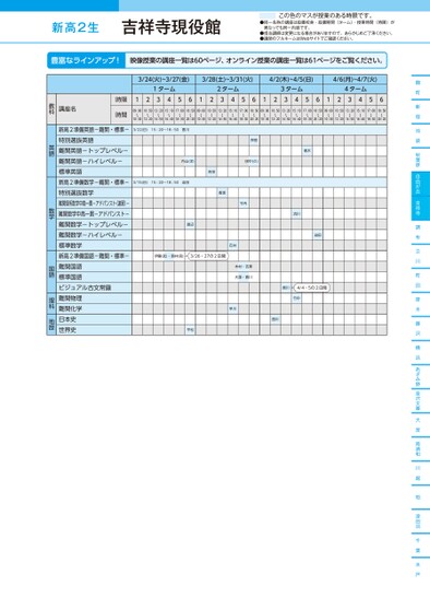 新高2生●同一名称の講座は設置校舎・設置期間(ターム)・授業時間(時限)が異なっても同一内容です。●担当講師は変更になる場合がありますので、あらかじめご了承ください。●講師のフルネームはWebサイトでご確認ください。この色のマスが授業のある時限です。麹町新宿池袋秋葉原自由が丘吉祥寺調布立川町田厚木藤沢横浜あざみ野金沢文庫大宮南浦和川越柏津田沼千葉水戸3/24(火)~3/27(金)3/28(土)~3/31(火)4/2(木)~4/5(日)4/6(月)~4/7(火)1ターム2ターム3ターム4ターム12345612345612345612345609:00〜10:3010:50〜12:2013:20〜14:5015:10〜16:4017:00〜18:3018:50〜20:2009:00〜10:3010:50〜12:2013:20〜14:5015:10〜16:4017:00〜18:3018:50〜20:2009:00〜10:3010:50〜12:2013:20〜14:5015:10〜16:4017:00〜18:3018:50〜20:2009:00〜10:3010:50〜12:2013:20〜14:5015:10〜16:4017:00〜18:3018:50〜20:203/22(日)15:20〜18:50香川内山(洋)吉田3/15(日)15:20〜18:50迫田押田田中(久)青木香坂竹内渡辺伊藤(武)・酒井(完)3/26・27の2日間石井木村・吉澤大窪・貴川早川平松流川迫田貴川4/4・5の2日間竹中西川講座名時限時間新高2準備英語-難関・標準-特別選抜英語難関英語-トップレベル-難関英語-ハイレベル-標準英語新高2準備数学-難関・標準-特別選抜数学難関理系数学中高一貫-アドバンスト(速習)-難関数学中高一貫-アドバンスト-難関数学-トップレベル-難関数学-ハイレベル-標準数学新高2準備国語-難関・標準-難関国語標準国語ビジュアル古文常識難関物理難関化学日本史世界史教科英語数学国語理科地歴吉祥寺現役館●2026年度/春期講習/東日本/吉祥寺/高2生/パターン14452026_58_3_340_32_20251104141807.csv/1ページ校了時削除