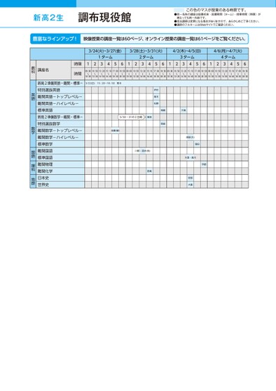 新高2生●同一名称の講座は設置校舎・設置期間(ターム)・授業時間(時限)が異なっても同一内容です。●担当講師は変更になる場合がありますので、あらかじめご了承ください。●講師のフルネームはWebサイトでご確認ください。この色のマスが授業のある時限です。3/24(火)~3/27(金)3/28(土)~3/31(火)4/2(木)~4/5(日)4/6(月)~4/7(火)1ターム2ターム3ターム4ターム12345612345612345612345609:00〜10:3010:50〜12:2013:20〜14:5015:10〜16:4017:00〜18:3018:50〜20:2009:00〜10:3010:50〜12:2013:20〜14:5015:10〜16:4017:00〜18:3018:50〜20:2009:00〜10:3010:50〜12:2013:20〜14:5015:10〜16:4017:00〜18:3018:50〜20:2009:00〜10:3010:50〜12:2013:20〜14:5015:10〜16:4017:00〜18:3018:50〜20:203/22(日)15:20〜18:50青木3/30・31の2日間窪田佐藤(健)川野・酒井(完)西尾村青木松野尾崎岡田大島高梨(大)窪田大窪・貴川宇都安部大瀧講座名時限時間新高2準備英語-難関・標準-特別選抜英語難関英語-トップレベル-難関英語-ハイレベル-標準英語新高2準備数学-難関・標準-特別選抜数学難関数学-トップレベル-難関数学-ハイレベル-標準数学難関国語標準国語難関物理難関化学日本史世界史教科英語数学国語理科地歴調布現役館●2026年度/春期講習/東日本/調布/高2生/パターン14452026_58_3_367_32_20251104141807.csv/1ページ校了時削除