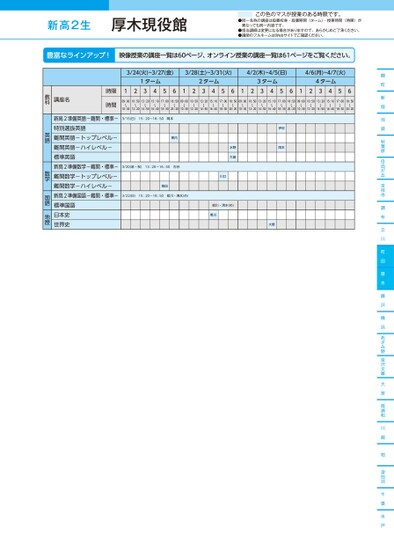 新高2生●同一名称の講座は設置校舎・設置期間(ターム)・授業時間(時限)が異なっても同一内容です。●担当講師は変更になる場合がありますので、あらかじめご了承ください。●講師のフルネームはWebサイトでご確認ください。この色のマスが授業のある時限です。麹町新宿池袋秋葉原自由が丘吉祥寺調布立川町田厚木藤沢横浜あざみ野金沢文庫大宮南浦和川越柏津田沼千葉水戸3/24(火)~3/27(金)3/28(土)~3/31(火)4/2(木)~4/5(日)4/6(月)~4/7(火)1ターム2ターム3ターム4ターム12345612345612345612345609:00〜10:3010:50〜12:2013:20〜14:5015:10〜16:4017:00〜18:3018:50〜20:2009:00〜10:3010:50〜12:2013:20〜14:5015:10〜16:4017:00〜18:3018:50〜20:2009:00〜10:3010:50〜12:2013:20〜14:5015:10〜16:4017:00〜18:3018:50〜20:2009:00〜10:3010:50〜12:2013:20〜14:5015:10〜16:4017:00〜18:3018:50〜20:203/15(日)15:20〜18:50岡本東内3/20(金・祝)13:20〜16:50古谷高田3/22(日)15:20〜18:50絵川・清水(め)水野大島川口絵川・清水(め)黒川伊吹岡本大野講座名時限時間新高2準備英語-難関・標準-特別選抜英語難関英語-トップレベル-難関英語-ハイレベル-標準英語新高2準備数学-難関・標準-難関数学-トップレベル-難関数学-ハイレベル-新高2準備国語-難関・標準-標準国語日本史世界史教科英語数学国語地歴厚木現役館●2026年度/春期講習/東日本/厚木/高2生/パターン14452026_58_3_332_32_20251104144216.csv/1ページ校了時削除