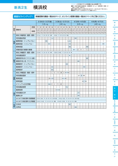 新高2生●同一名称の講座は設置校舎・設置期間(ターム)・授業時間(時限)が異なっても同一内容です。●担当講師は変更になる場合がありますので、あらかじめご了承ください。●講師のフルネームはWebサイトでご確認ください。この色のマスが授業のある時限です。麹町新宿池袋秋葉原自由が丘吉祥寺調布立川町田厚木藤沢横浜あざみ野金沢文庫大宮南浦和川越柏津田沼千葉水戸3/24(火)~3/27(金)3/28(土)~3/31(火)4/2(木)~4/5(日)4/6(月)~4/7(火)1ターム2ターム3ターム4ターム12345612345612345612345609:00〜10:3011:00〜12:3013:20〜14:5015:20〜16:5017:20〜18:5019:20〜20:5009:00〜10:3011:00〜12:3013:20〜14:5015:20〜16:5017:20〜18:5019:20〜20:5009:00〜10:3011:00〜12:3013:20〜14:5015:20〜16:5017:20〜18:5019:20〜20:5009:00〜10:3011:00〜12:3013:20〜14:5015:20〜16:5017:20〜18:5019:20〜20:503/21(土)17:20〜20:50天倉4/6(月)17:20〜20:50柴田小山新野押田香川内山(九)天倉幸長3/22(日)15:20~18:50田井3/28(土)・29(日)17:20~18:50隣3/2土3/9(日)1::50〜50田井仲野栗原清川9:00~11:10隣隣依田生田岩村3/30・31の2日間一瀬・和田小林・佐河一瀬・大野税田3/26・27の2日間杉山佐々木(哲)瀬谷横田板谷金子・園・髙橋森永・隼坂小竹浅利4/2(木)・3(金)19:20~20:50佐々木(哲)4/4(土)・5(日)19:20~20:50佐々木(哲)43金)44土)4/5(19:0〜0501:0〜20:50佐々木(哲)佐々木(哲)3/24(火)・25(水)19:20~20:50岡島3/26(木)・27(金)19:20~20:50岡島〜3/25(水19:0〜053/6木〜3/27(金):〜2050岡島岡島黒川斉藤時限時間講座名教科新高2準備英語-難関・標準-特別選抜英語難関英語-トップレベル-難関英語-ハイレベル-標準英語受験英語の基礎の基礎新高2準備数学-難関・標準-特別選抜数学難関理系数学中高一貫-アドバンスト(速習)-難関数学中高一貫-アドバンスト-難関数学-トップレベル-難関数学-ハイレベル-標準数学新高2準備国語-難関・標準-特別選抜国語難関国語標準国語ビジュアル古文常識特別選抜物理難関物理特別選抜化学難関化学はじめての高校理科(物理基礎)はじめての高校理科(化学基礎)日本史世界史英語数学国語理科地歴横浜校●2026年度/春期講習/東日本/横浜/高2生/パターン14452026_58_3_321_32_20251104141807.csv/1ページ校了時削除