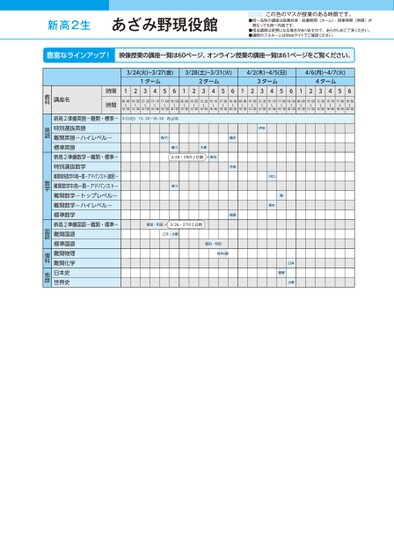 豊富なラインアップ!映像授業の講座一覧は60ページ、オンライン授業の講座一覧は61ページをご覧ください。新高2生あざみ野現役館この色のマスが授業のある時限です。●同一名称の講座は設置校舎・設置期間(ターム)・授業時間(時限)が異なっても同一内容です。●担当講師は変更になる場合がありますので、あらかじめご了承ください。●講師のフルネームはWebサイトでご確認ください。3/24(火)~3/27(金)3/28(土)~3/31(火)4/2(木)~4/5(日)4/6(月)~4/7(火)1ターム2ターム3ターム4ターム12345612345612345612345609:00〜10:3010:50〜12:2013:20〜14:5015:10〜16:4017:00〜18:3018:50〜20:2009:00〜10:3010:50〜12:2013:20〜14:5015:10〜16:4017:00〜18:3018:50〜20:2009:00〜10:3010:50〜12:2013:20〜14:5015:10〜16:4017:00〜18:3018:50〜20:2009:00〜10:3010:50〜12:2013:20〜14:5015:10〜16:4017:00〜18:3018:50〜20:203/22(日)15:20〜18:50内山(洋)森(千)清川大島3/28・29の2日間板谷流川伊吹川口塚本隣鏑木合田福島飯田・和田3/26・27の2日間三河・大野飯田・和田鈴木(誠)菅野臼井大野講座名時限時間新高2準備英語-難関・標準-特別選抜英語難関英語-ハイレベル-標準英語新高2準備数学-難関・標準-特別選抜数学難関理系数学中高一貫-アドバンスト(速習)-難関数学中高一貫-アドバンスト-難関数学-トップレベル-難関数学-ハイレベル-標準数学新高2準備国語-難関・標準-難関国語標準国語難関物理難関化学日本史世界史教科英語数学国語理科地歴●2026年度/春期講習/東日本/あざみ野/高2生/パターン14452026_58_3_339_32_20251104141807.csv/1ページ校了時削除