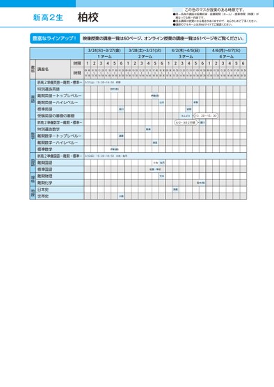 新高2生●同一名称の講座は設置校舎・設置期間(ターム)・授業時間(時限)が異なっても同一内容です。●担当講師は変更になる場合がありますので、あらかじめご了承ください。●講師のフルネームはWebサイトでご確認ください。この色のマスが授業のある時限です。3/24(火)~3/27(金)3/28(土)~3/31(火)4/2(木)~4/5(日)4/6(月)~4/7(火)1ターム2ターム3ターム4ターム12345612345612345612345609:00〜10:3010:50〜12:2013:20〜14:5015:10〜16:4017:00〜18:3018:50〜20:2009:00〜10:3010:50〜12:2013:20〜14:5015:10〜16:4017:00〜18:3018:50〜20:2009:00〜10:3010:50〜12:2013:20〜14:5015:10〜16:4017:00〜18:3018:50〜20:2009:00〜10:3010:50〜12:2013:20〜14:5015:10〜16:4017:00〜18:3018:50〜20:20仲野岩間えんどう13:20~15:304/2・3の2日間夏川3/21(土)13:20〜16:50仲野田村(喜)成川遠藤伊東(鋼)3/22(日)15:20〜18:50小池・佐河伊藤(直)山川飯島島田小池・佐河松藤・隼坂竹中鈴木(翔)髙橋小嶋時限時間講座名教科新高2準備英語-難関・標準-特別選抜英語難関英語-トップレベル-難関英語-ハイレベル-標準英語受験英語の基礎の基礎新高2準備数学-難関・標準-特別選抜数学難関数学-トップレベル-難関数学-ハイレベル-標準数学新高2準備国語-難関・標準-難関国語標準国語難関物理難関化学日本史世界史英語数学国語理科地歴柏校●2026年度/春期講習/東日本/柏/高2生/パターン14452026_58_3_322_32_20251104185828.csv/1ページ校了時削除