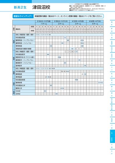 新高2生●同一名称の講座は設置校舎・設置期間(ターム)・授業時間(時限)が異なっても同一内容です。●担当講師は変更になる場合がありますので、あらかじめご了承ください。●講師のフルネームはWebサイトでご確認ください。この色のマスが授業のある時限です。麹町新宿池袋秋葉原自由が丘吉祥寺調布立川町田厚木藤沢横浜あざみ野金沢文庫大宮南浦和川越柏津田沼千葉水戸3/24(火)~3/27(金)3/28(土)~3/31(火)4/2(木)~4/5(日)4/6(月)~4/7(火)1ターム2ターム3ターム4ターム12345612345612345612345609:00〜10:3010:50〜12:2013:20〜14:5015:10〜16:4017:00〜18:3018:50〜20:2009:00〜10:3010:50〜12:2013:20〜14:5015:10〜16:4017:00〜18:3018:50〜20:2009:00〜10:3010:50〜12:2013:20〜14:5015:10〜16:4017:00〜18:3018:50〜20:2009:00〜10:3010:50〜12:2013:20〜14:5015:10〜16:4017:00〜18:3018:50〜20:203/22(日)13:20〜16:50加藤小山新野石橋田村(喜)伊藤(直)加藤石橋9:00~11:104/2・3の2日間三木日髙飯島伊東(鋼)柳沢3/21(土)13:20〜16:50松藤・阿部(順)手塚・中西・酒井(辰)手塚・中西辰)天野天野小宮・中村上野・阿部(順)浅利黒川鈴木(翔)髙岡中野(健)佐々木(哲)時限時間講座名教科新高2準備英語-難関・標準-特別選抜英語難関英語-トップレベル-難関英語-ハイレベル-標準英語受験英語の基礎の基礎新高2準備数学-難関・標準-特別選抜数学難関理系数学中高一貫-アドバンスト(速習)-難関数学-トップレベル-難関数学-ハイレベル-標準数学新高2準備国語-難関・標準-特別選抜国語難関国語標準国語特別選抜物理難関物理特別選抜化学難関化学日本史世界史英語数学国語理科地歴津田沼校●2026年度/春期講習/東日本/津田沼/高2生/パターン14452026_58_3_327_32_20251104190004.csv/1ページ校了時削除