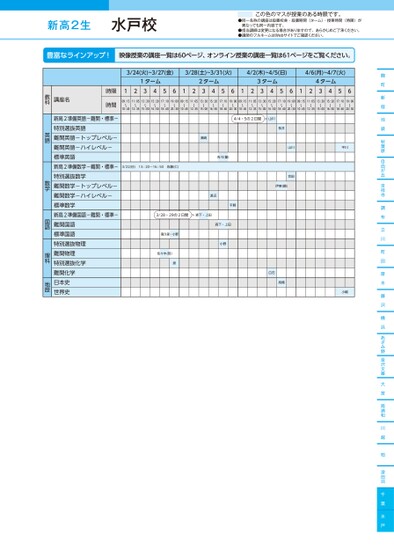 新高2生●同一名称の講座は設置校舎・設置期間(ターム)・授業時間(時限)が異なっても同一内容です。●担当講師は変更になる場合がありますので、あらかじめご了承ください。●講師のフルネームはWebサイトでご確認ください。この色のマスが授業のある時限です。麹町新宿池袋秋葉原自由が丘吉祥寺調布立川町田厚木藤沢横浜あざみ野金沢文庫大宮南浦和川越柏津田沼千葉水戸3/24(火)~3/27(金)3/28(土)~3/31(火)4/2(木)~4/5(日)4/6(月)~4/7(火)1ターム2ターム3ターム4ターム12345612345612345612345609:15〜10:4511:05〜12:3513:30〜15:0015:20〜16:5017:10〜18:4019:00〜20:3009:15〜10:4511:05〜12:3513:30〜15:0015:20〜16:5017:10〜18:4019:00〜20:3009:15〜10:4511:05〜12:3513:30〜15:0015:20〜16:5017:10〜18:4019:00〜20:3009:15〜10:4511:05〜12:3513:30〜15:0015:20〜16:5017:10〜18:4019:00〜20:304/4・5の2日間山川桜井濱崎吉川(量)3/22(日)13:20〜16:50佐藤(仁)渡辺平野3/28・29の2日間森下・上田森下・上田小野喜久里・小野佐々木(哲)原山川合田伊東(鋼)白石髙橋平川小嶋講座名時限時間新高2準備英語-難関・標準-特別選抜英語難関英語-トップレベル-難関英語-ハイレベル-標準英語新高2準備数学-難関・標準-特別選抜数学難関数学-トップレベル-難関数学-ハイレベル-標準数学新高2準備国語-難関・標準-難関国語標準国語特別選抜物理難関物理特別選抜化学難関化学日本史世界史教科英語数学国語理科地歴水戸校●2026年度/春期講習/東日本/水戸/高2生/パターン14452026_58_3_344_32_20251104141807.csv/1ページ校了時削除