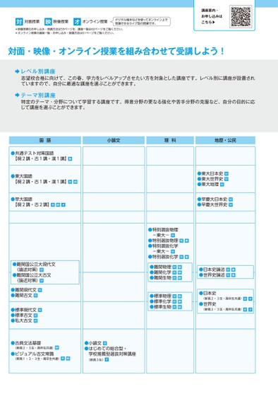 対面・映像・オンライン授業を組み合わせて受講しよう!対対面授業映映像授業オオンライン授業デジタル端末などを使ってオンライン上で受講できるライブ型の授業です。*映像授業のお申し込み・受講方法は59ページを、講座一覧は60ページをご覧ください。*オンライン授業の講座一覧・お申し込み・受講方法は61ページをご覧ください。講座案内・お申し込みはこちら▶レベル別講座志望校合格に向けて、この春、学力をレベルアップさせたい方を対象とした講座です。レベル別に講座が設置されていますので、自分に最適な講座を選ぶことができます。テーマ別講座特定のテーマ・分野について学習する講座です。得意分野の更なる強化や苦手分野の克服など、自分の目的に応じて講座を選ぶことができます。国語小論文理科地歴・公民●共通テスト対策国語【現2講・古1講・漢1講】映●東大国語【現2講・古1講・漢1講】対映●早大国語【現2講・古2講】対映オ●特別選抜物理-東大-対●特別選抜物理対映●特別選抜化学-東大-対●特別選抜化学対映●難関物理対映●難関化学対映●難関生物対映●標準物理対映●標準化学対映●標準生物対映●難関国公立大現代文(論述対策)対●難関国公立大古文(論述対策)対●難関現代文対●難関古文対●標準現代文対●標準古文対●私大古文対●古典文法基礎(新高2・3生・高卒生共通)映●ビジュアル古文常識(新高1・2・3生・高卒生共通)対映●小論文対●はじめての総合型・学校推薦型選抜対策講座(新高3生)オ●東大日本史対●東大世界史対●東大地理対●早慶大日本史対●早慶大世界史対●日本史論述対映●世界史論述対映●日本史●世界史(新高2・3生・高卒生共通)対オ(新高2・3生・高卒生共通)対オ