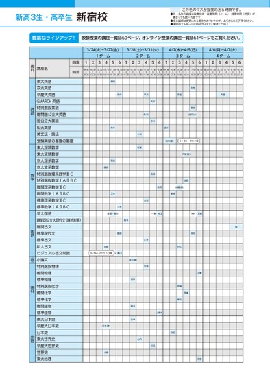 新高3生・高卒生●同一名称の講座は設置校舎・設置期間(ターム)・授業時間(時限)が異なっても同一内容です。●担当講師は変更になる場合がありますので、あらかじめご了承ください。●講師のフルネームはWebサイトでご確認ください。この色のマスが授業のある時限です。3/24(火)~3/27(金)3/28(土)~3/31(火)4/2(木)~4/5(日)4/6(月)~4/7(火)1ターム2ターム3ターム4ターム12345612345612345612345609:0010:5013:2015:1017:0018:5009:0010:5013:2015:1017:0018:5009:0010:5013:2015:1017:0018:5009:0010:5013:2015:1017:0018:5010:3012:2014:5016:4018:3020:2010:3012:2014:5016:4018:3020:2010:3012:2014:5016:4018:3020:2010:3012:2014:5016:4018:3020:20時限時間講座名教科新宿校瀬﨑作矢川早田柴倉天新野矢作赤木森(千)青柳田中(久)作矢川成小林石塚長野吉川(量)9:00~11:10伊東(敦)生田長野佐藤(健)野秦山村・瀬一崎宮・村木園古谷山下宮原石塚飯田木三三木川貴・部軽鈴木部軽崎宮3/26・27の2日間貴川清水(唯)酒井倉田山中坂本(勝)小嶋村木山村岡島寺田岡島小野伊藤山野井依田山内沼田東大英語京大英語早慶大英語GMARCH英語特別選抜英語難関国公立大英語国公立大英語私大英語英文法・語法受験英語の基礎の基礎東大理類数学東大文類数学京大理系数学京大文系数学特別選抜理系数学ⅢC特別選抜数学ⅠAⅡBC難関理系数学ⅢC難関数学ⅠAⅡBC標準理系数学ⅢC標準数学ⅠAⅡBC早大国語難関国公立大現代文(論述対策)難関古文標準現代文標準古文私大古文ビジュアル古文常識小論文特別選抜物理難関物理標準物理特別選抜化学難関化学標準化学難関生物標準生物東大日本史早慶大日本史日本史東大世界史早慶大世界史世界史東大地理英語数学国語小論文理科地歴●2026年度/春期講習/東日本/新宿/高3・卒生/パターン14452026_58_3_329_11_20251106165356.csv/1ページ校了時削除